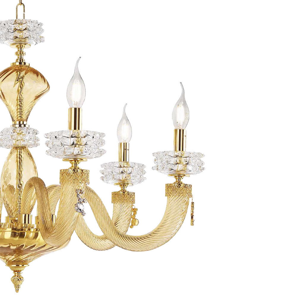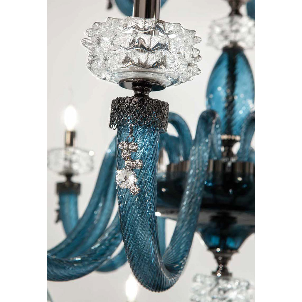 La araña de suspensión de 6 luces es un accesorio de iluminación de lujofabricado íntegramente en Italia en vidrio artesanal de la más alta calidad. Lo que lo hace único y majestuoso son los detalles joya , también hechos a mano, y los acabados metalizados que dan vida a un estilo clásico de antaño, cuyo encanto se convierte en protagonista en el espacio destino.