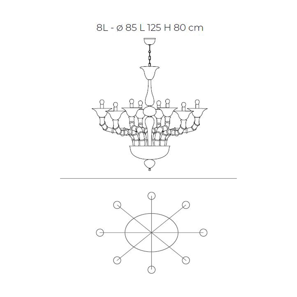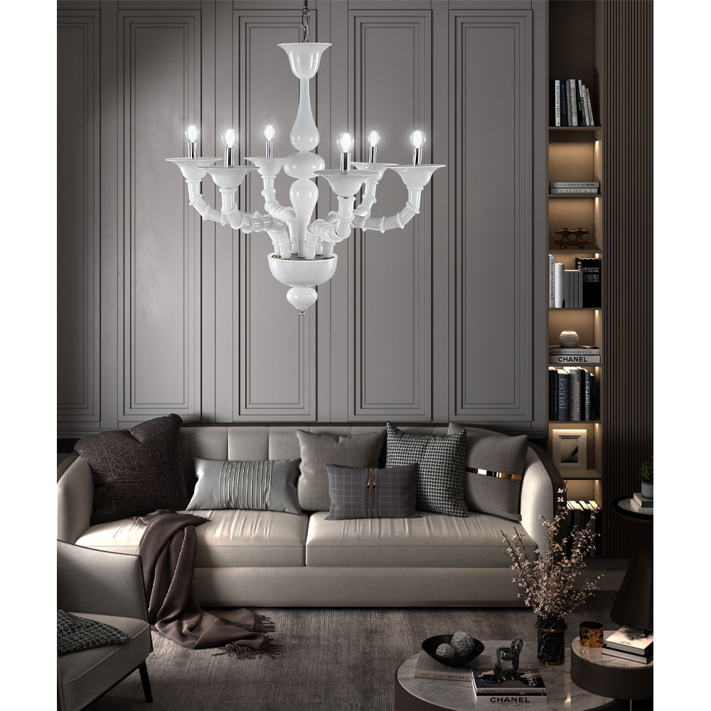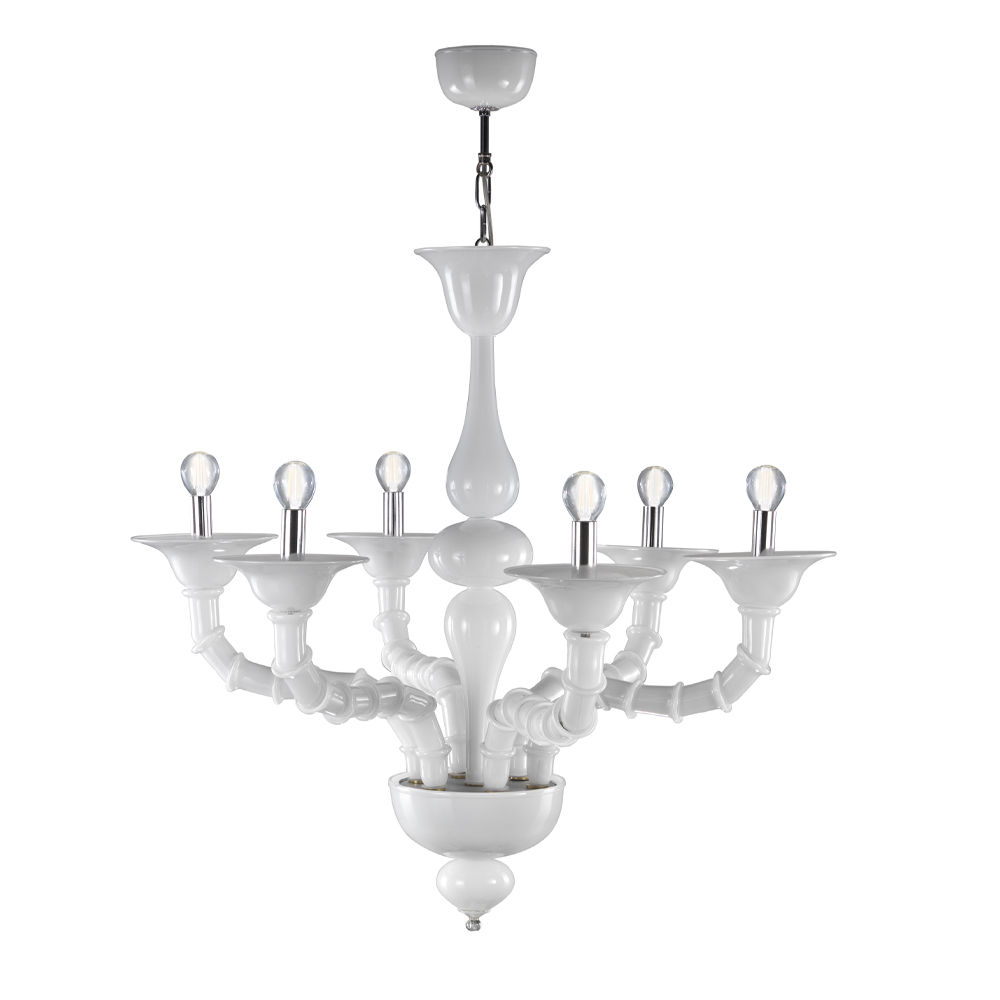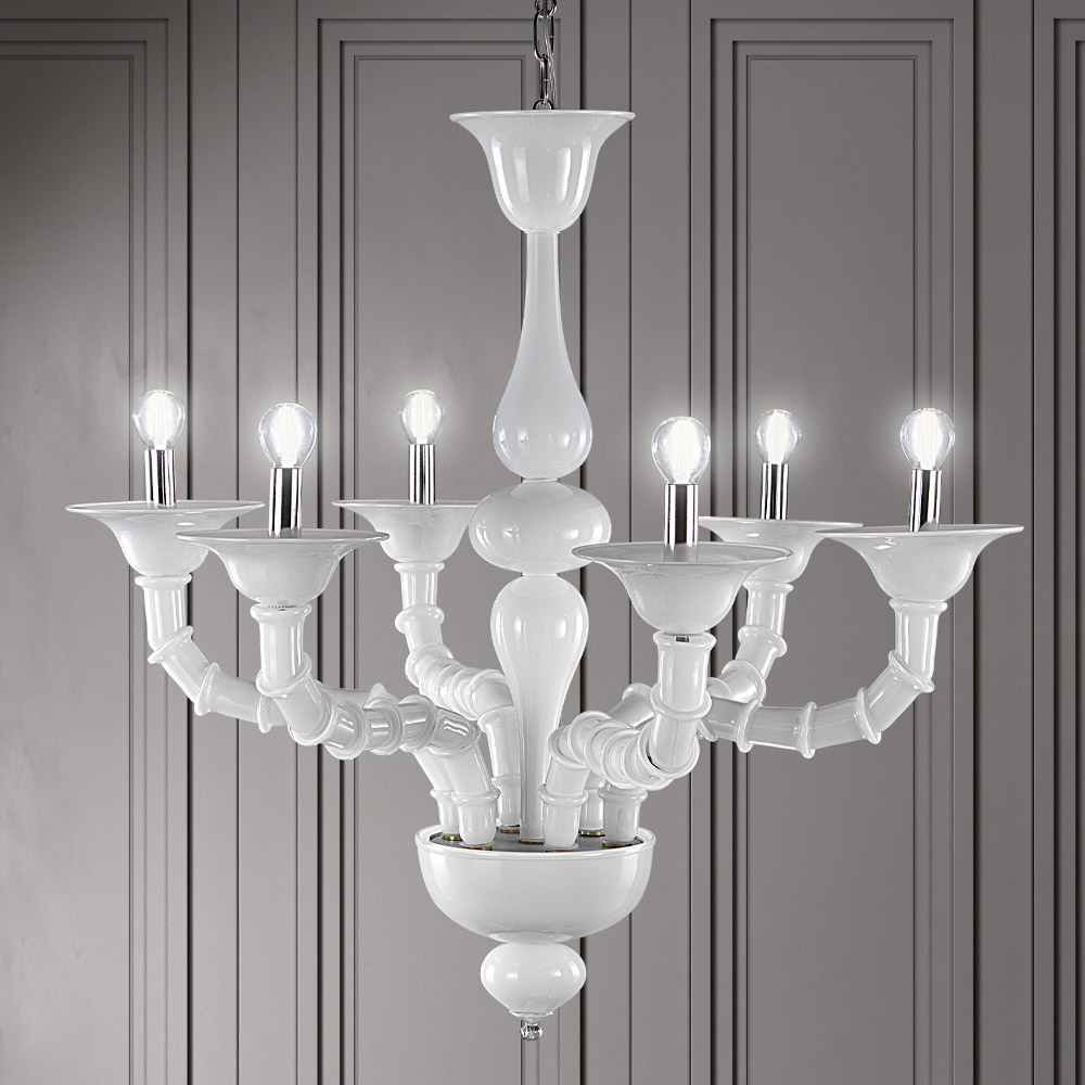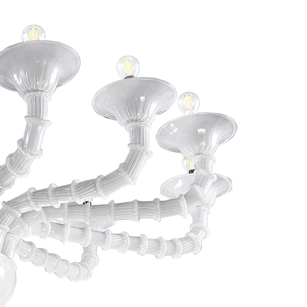 vidrio Rezzonico blanco soplado a mano diseñado para completar grandes áreas de la casa como comedores o salas de estar, dando vida a una iluminación de alta calidad con una personalidad intrigante. La longitud de los brazos es posible gracias a la técnica particular definida como "bossole" que consiste en unir varias piezas de vidrio dando prueba de una