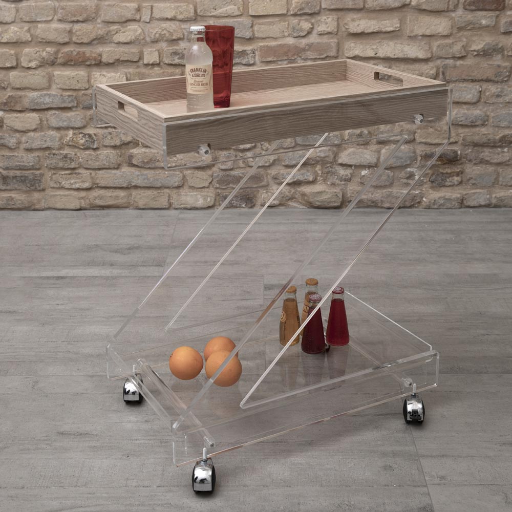 Carro de cristal acrílico transparente con ruedas y bandeja de 2 acabados, fabricado en Italia.