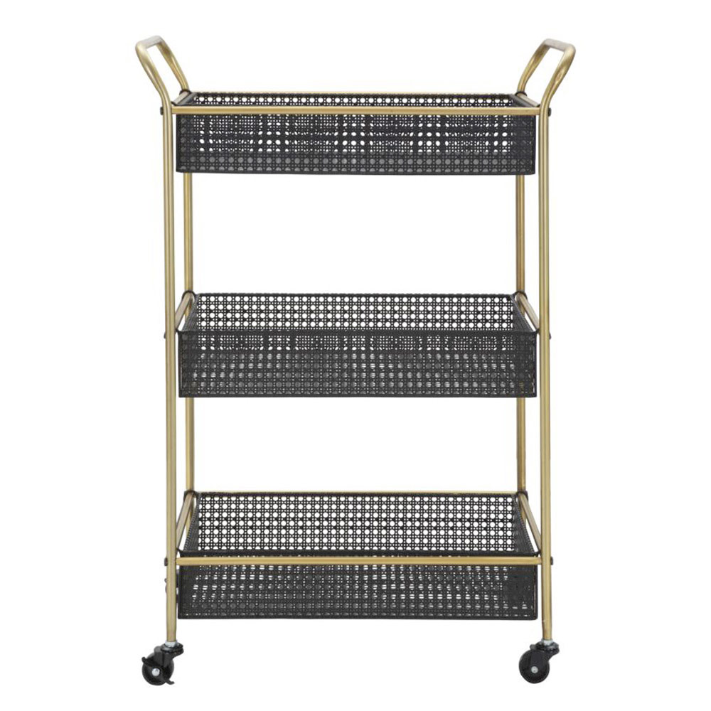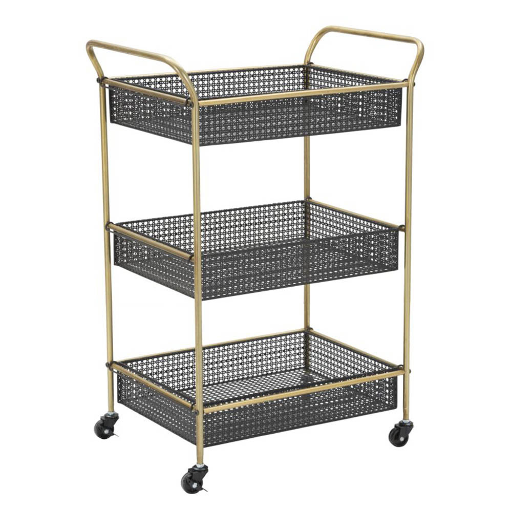 Carro de comida fabricado en hierro con estructura acabado dorado equipado con 3 estantes y completo con ruedas. Un diseño versátil,moderno y funcional ideal para espacios domésticos como comedores o cocinas donde es un complemento práctico y útil y al mismo tiempo perfecto para completar el mobiliario con un toque de personalidad cautivadora .