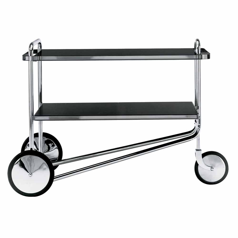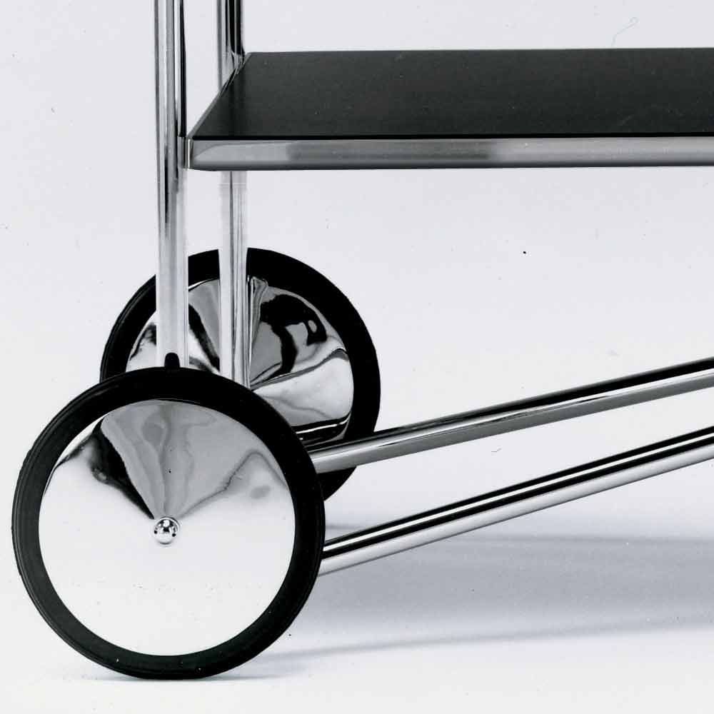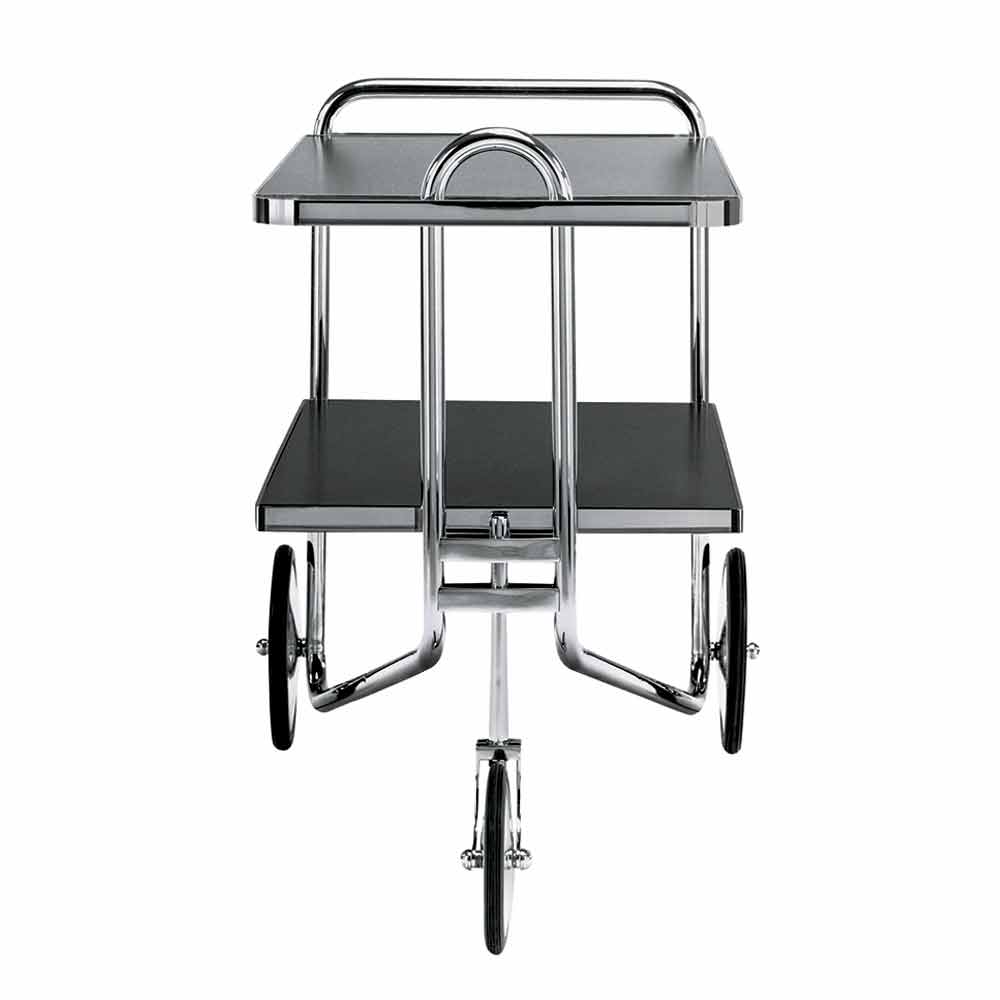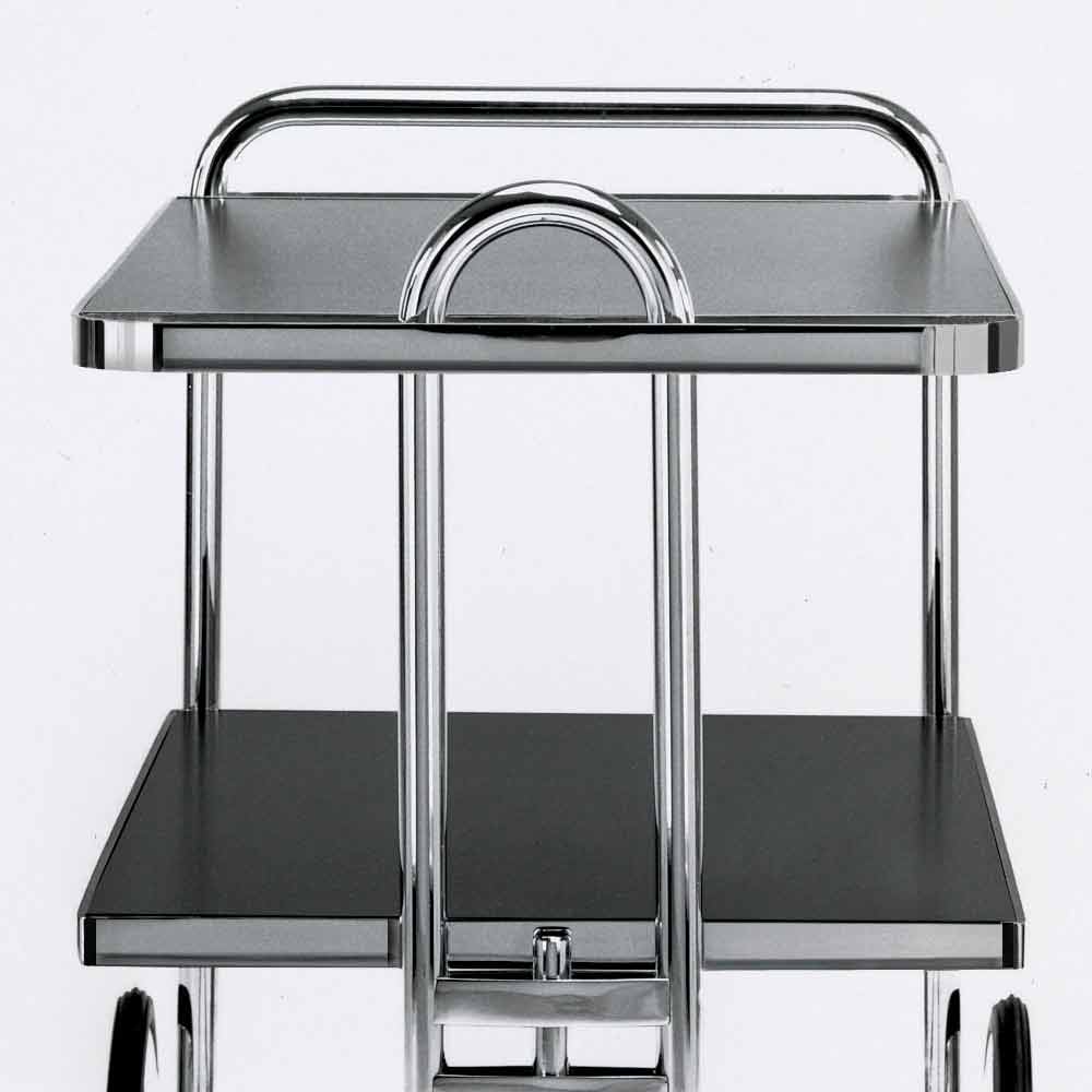 Carrito de comida de acero cromado con estantes de laminado negro Made in Italy.