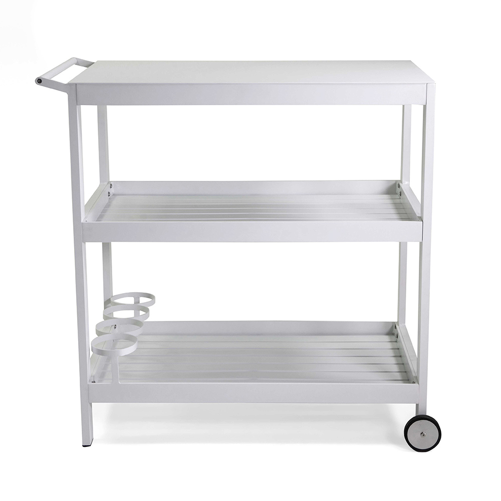 Carro de exterior fabricado con estructura de aluminio con recubrimiento en polvo con 2 ruedas y portabotellas.