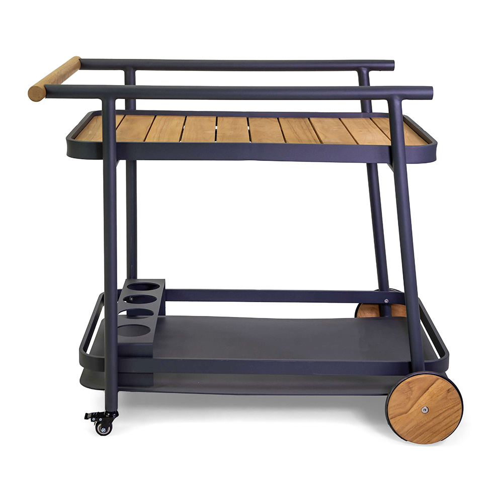 Carro de exterior fabricado con estructura de aluminio con recubrimiento de polvo, parte superior plana en listones de madera de teca de 15 mm, asa de teca de diámetro 35x70 mm