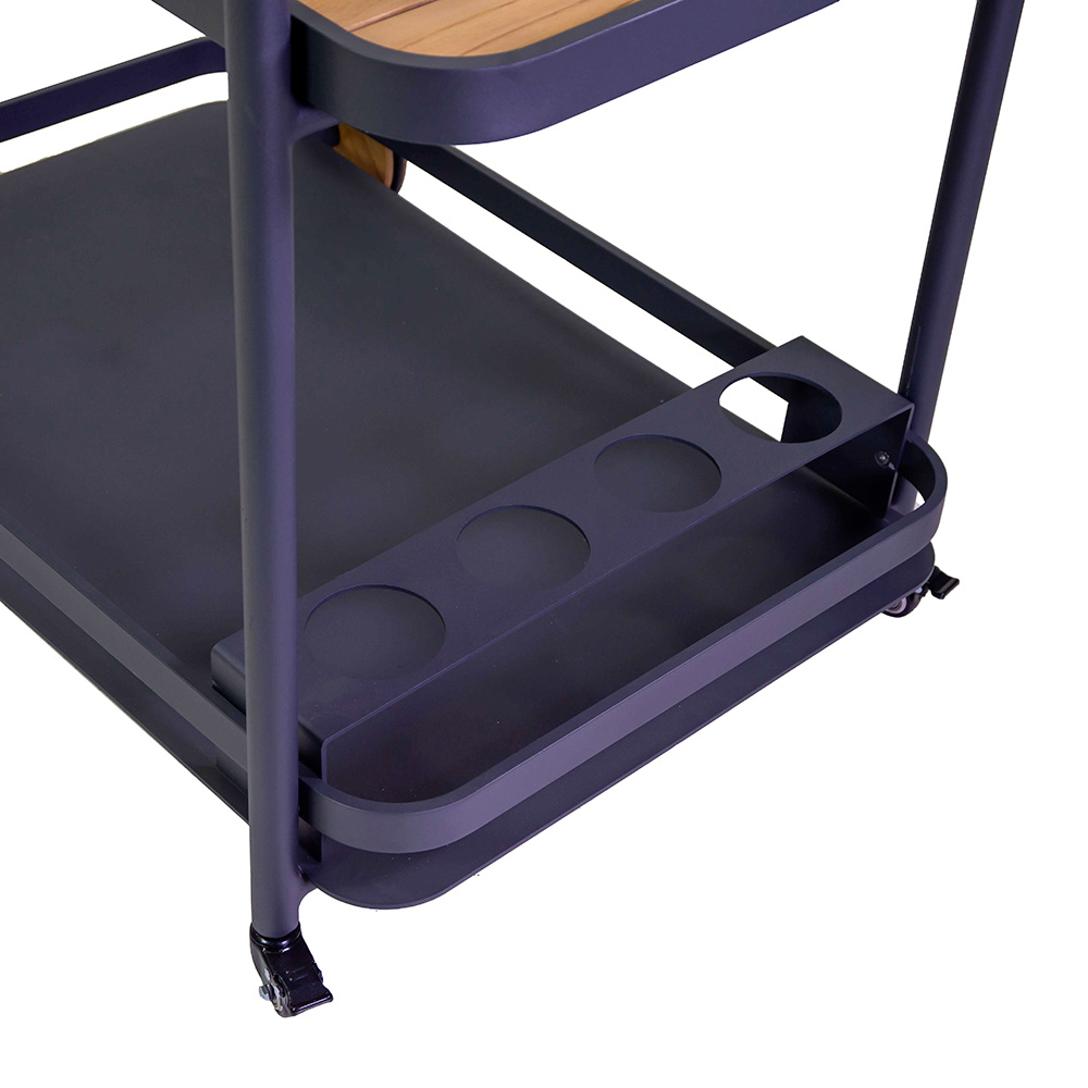 La parte superior de madera de teca añade una calidez natural y una resistencia superior a los elementos, por lo que no sólo es hermosa, sino también duradera. Completo con un espacioso estante inferior, este carrito ofrece un amplio espacio para guardar platos, vasos y accesorios para servir, mientras que el práctico portabotellas integrado garantiza que sus bebidas estén siempre al alcance de la mano.