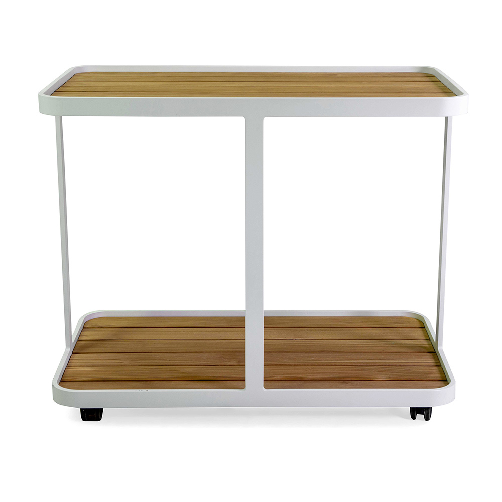 Carro de exterior fabricado con estructura de aluminio con recubrimiento en polvo y tapa de listones de madera de teca de 15 mm.