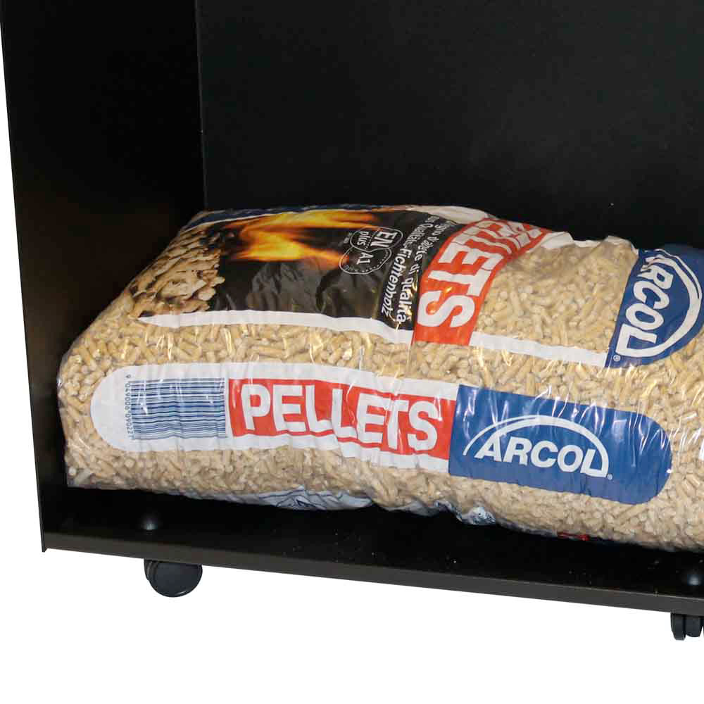 Este carro para bolsas de pellet es un práctico objeto diseñado para facilitar la gestión y almacenamiento del combustible para su chimenea o estufa de pellet. El diseño resistente y el acabado negro se integran discretamente en cualquier entorno doméstico y ofrecen una estética limpia que no compromete la funcionalidad.