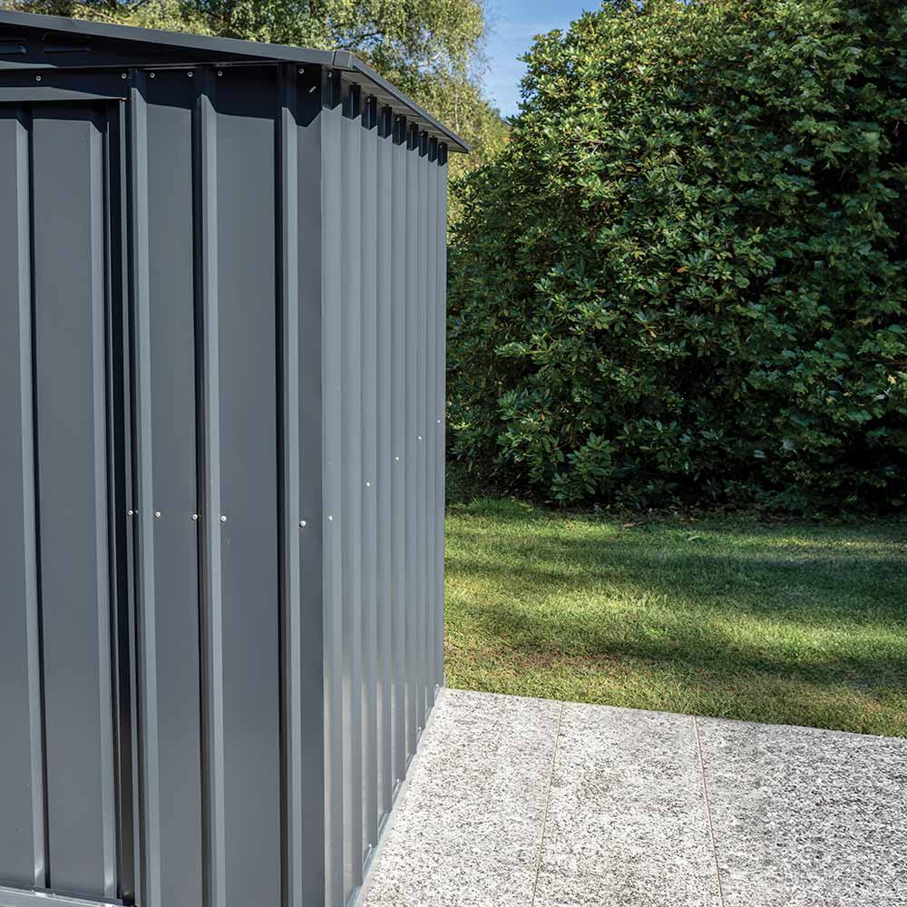 El color oscuro y el diseño de paneles verticales dan un aspecto moderno que encaja perfectamente en cualquier jardín o espacio exterior, manteniendo la armonía estética. La puerta facilita el acceso y movimiento de objetos voluminosos, haciendo la casa sumamente funcional .