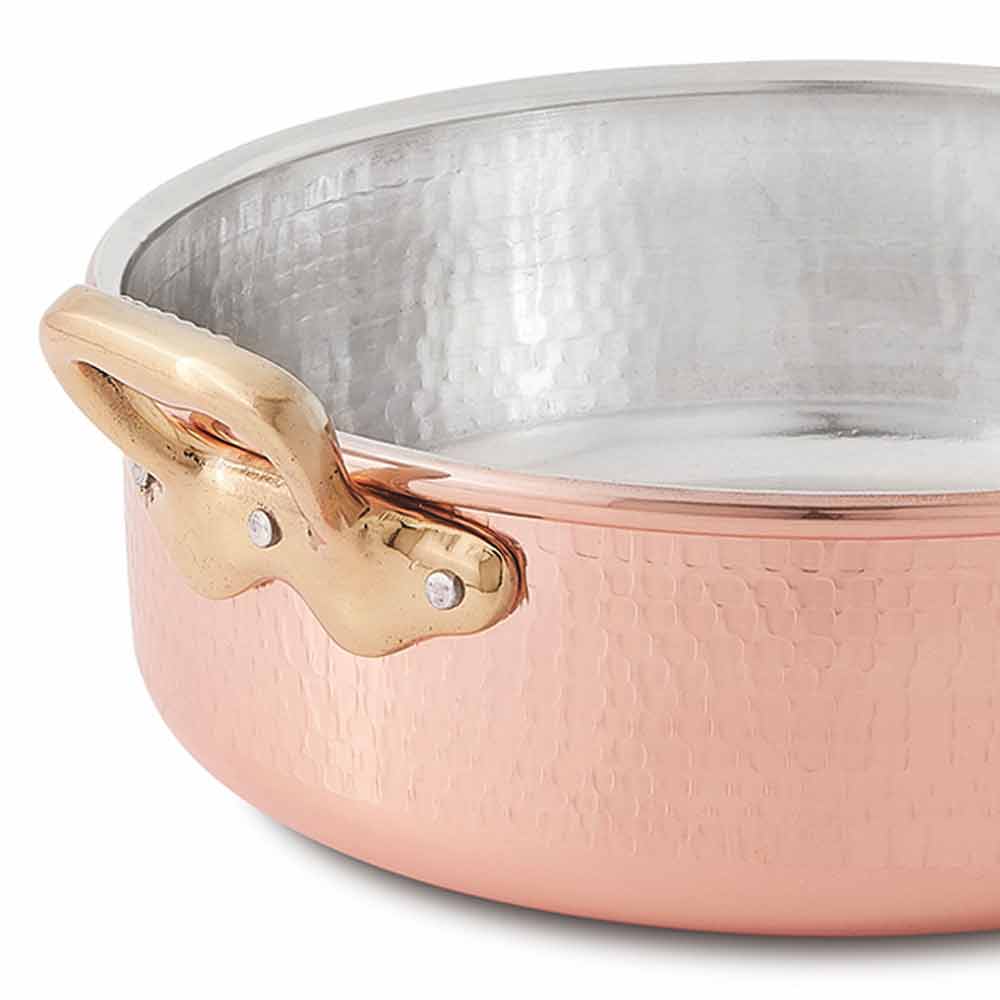 Cazuela baja redonda de cobre martillado a mano con asas de latón de 20 cm fabricada en Italia.