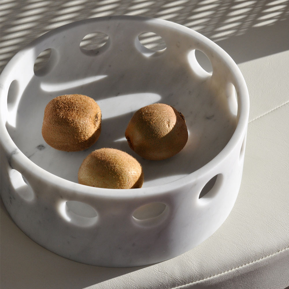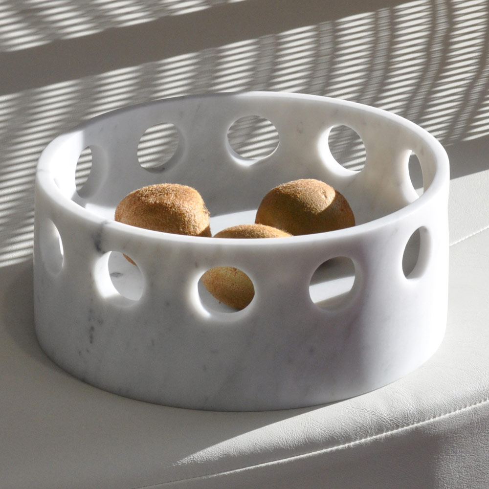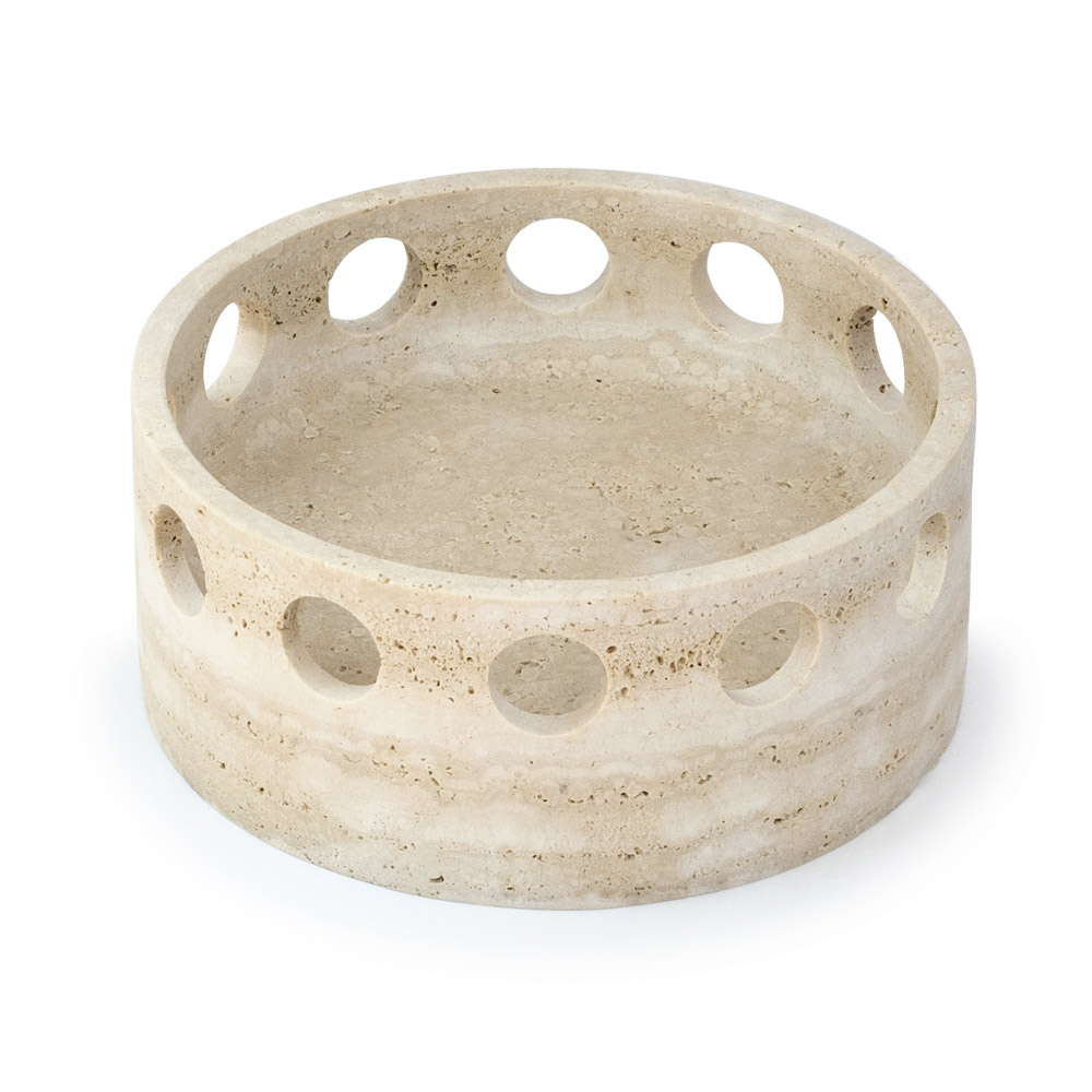 Aporta un toque de elegancia refinada a tu hogar con este centro de mesa/bandeja de bolsillo de mármol . El diseño redondo y las perforaciones simétricas la convierten en una pieza única y elegante , perfecta para enriquecer fácilmente cualquier mesa o consola. La calidad del mármol, un material noble y duradero , celebra lo mejor de la artesanía italiana .