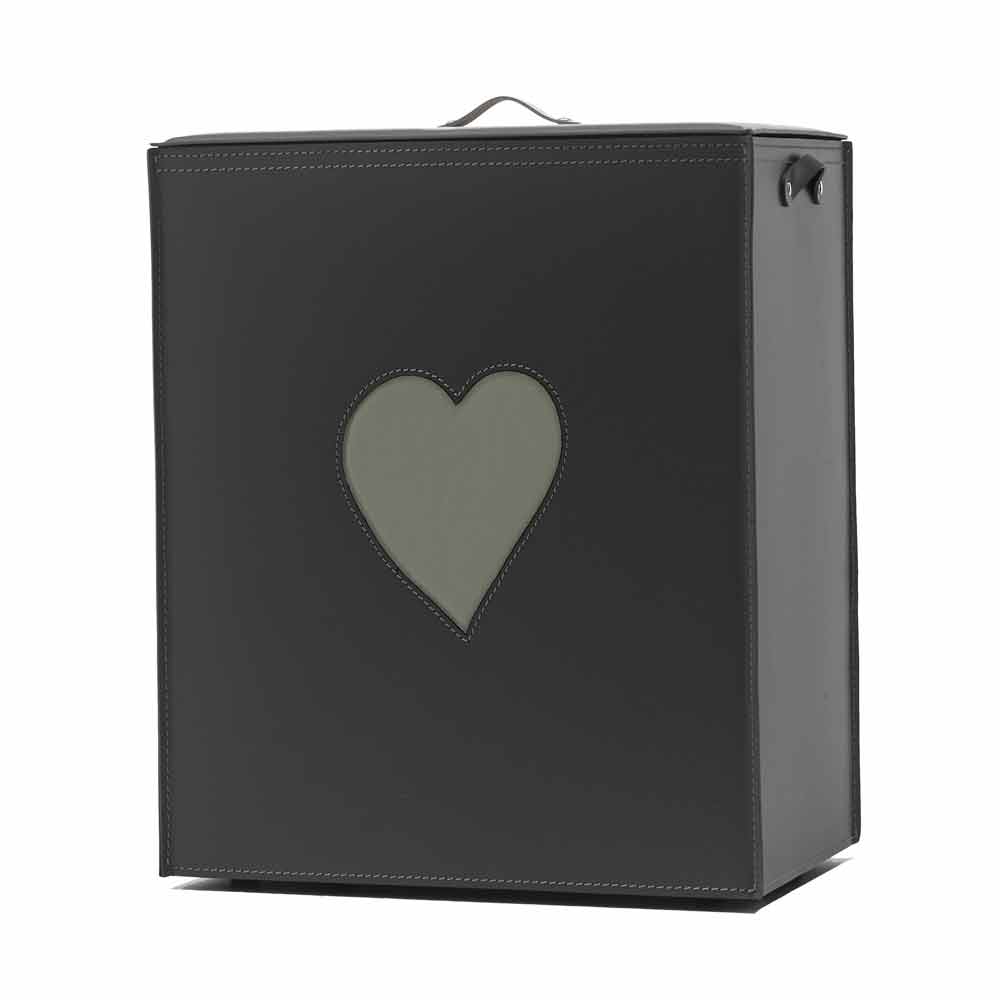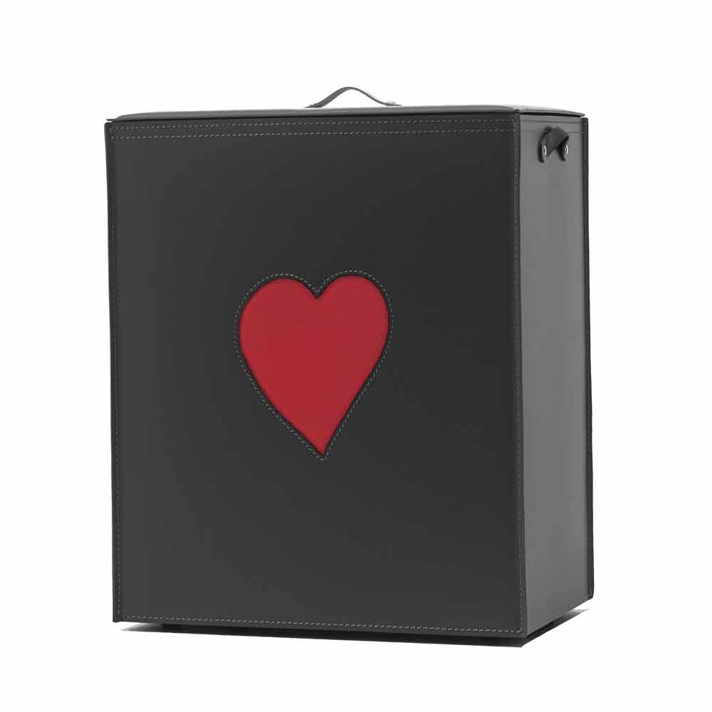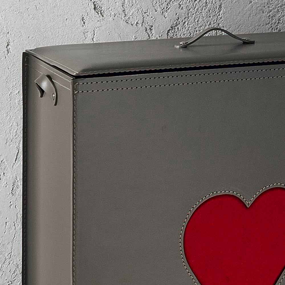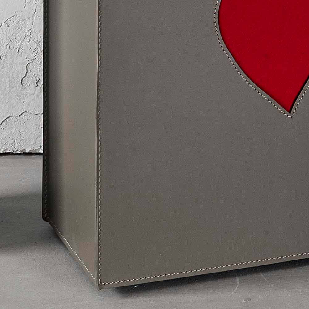 Cesta de lavadero de diseño en 100% cuero italiano Adele. Cesto de ropa rectangular realizado en cuero regenerado tanto en el interior como en el exterior, con una decoración en forma de corazón elegida de color rojo o marrón. El fondo está hecho de madera contrachapada, también cubierta en cuero. Equipado con prácticos pies de goma. En el interior hay una bolsa de algodón extraíble. Los materiales de calidad, la atención al detalle resistente y meticulosa caracterizan la cesta de lavandería Adele, hecha completamente en Italia. Un complemento no solo funcional, sino también decorativo. Adele está disponible en diferentes colores, elige el que prefieras.