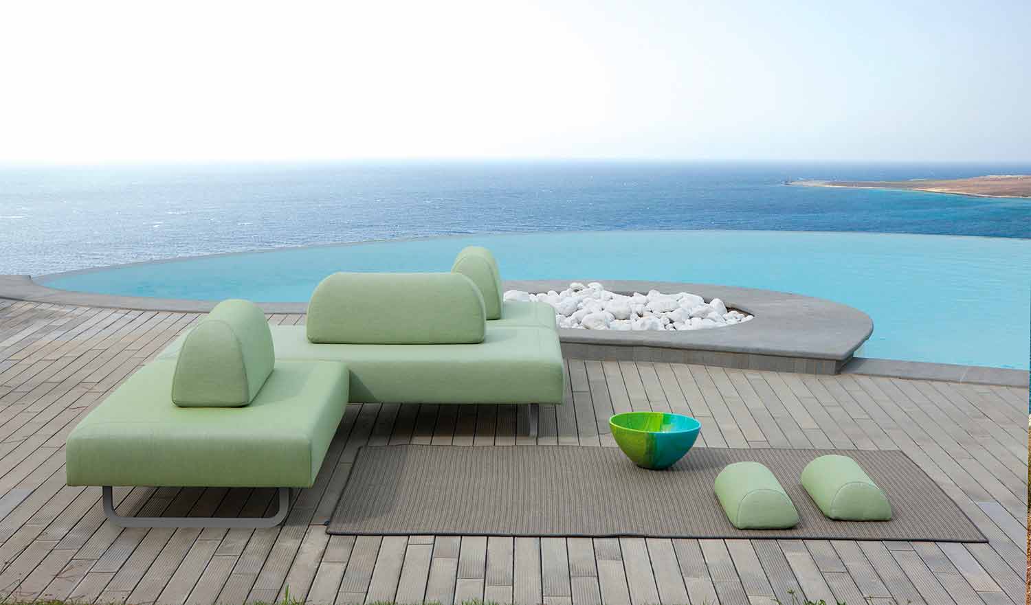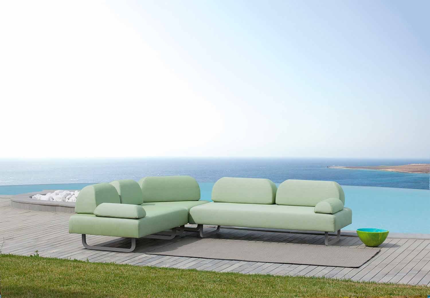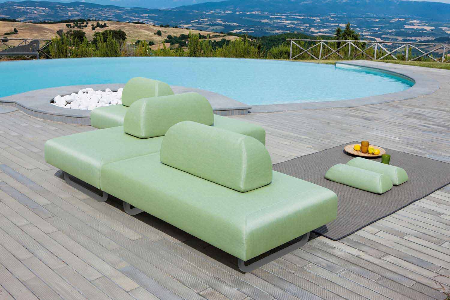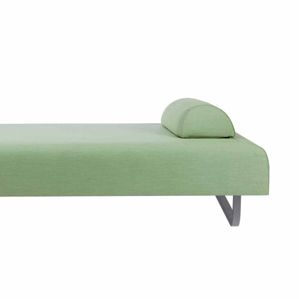 Chaise longue de exterior fabricada en Italia con materias primas seleccionadas que garantizan un producto final de alta calidad. Caracterizada por un diseño entre futurista y retro para crear un producto único e innovador, la chaise longue es ideal tanto para exteriores como para interiores e incluye un práctico y cómodo reposacabezas/reposabrazos con el mismo acabado que el producto. Su estructura interna es de madera resistente e incluye un acolchado sellado con tejido exterior 100 % acrílico teñido, utilizado precisamente por su resistencia a los agentes atmosféricos , las manchas, el moho y los rayos UV. Las patas son de hierro galvanizado con recubrimiento en polvo y acabado mate.