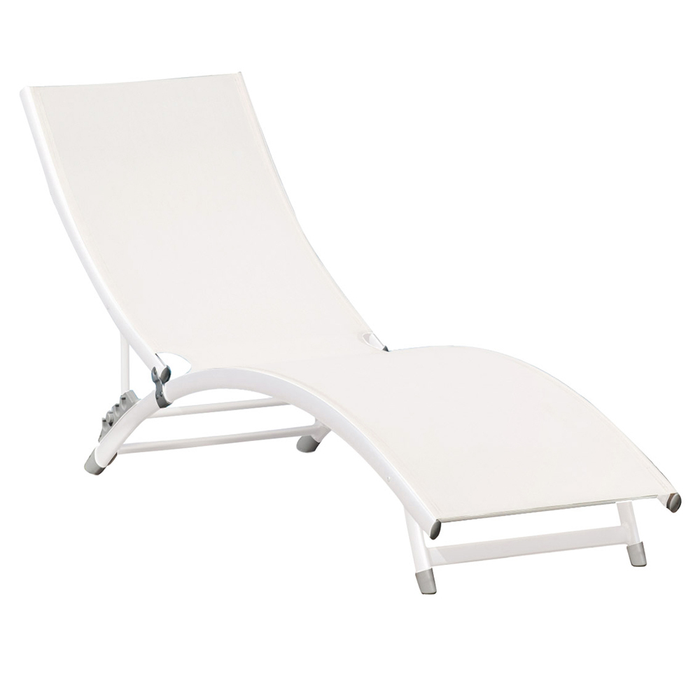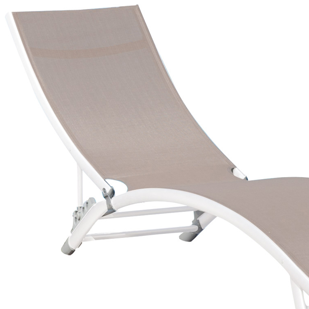 Tumbona de jardín apilable con estructura fabricada en aluminio blanco con tubo de 40 x 20 mm y asiento en textileno de 600 gr . Un diseño elegante y funcional marcado por líneas esenciales que lo hacen perfecto para contextos exteriores como playas, balnearios y complejos turísticos exclusivos, pero también espacios domésticos como jardines y piscinas.