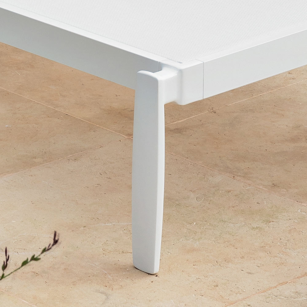 La estructura es de aluminio con recubrimiento de polvo epoxi combinado con el asiento de textilene. El colchón opcional es extraíble y está hecho de tela "Sunbrella" repelente al agua con relleno de espuma de poliuretano encerrado en una membrana impermeable pero transpirable. Apilable para 4.