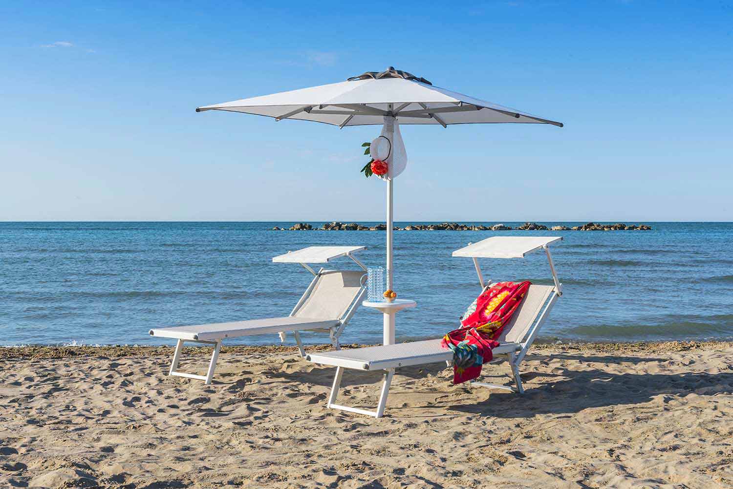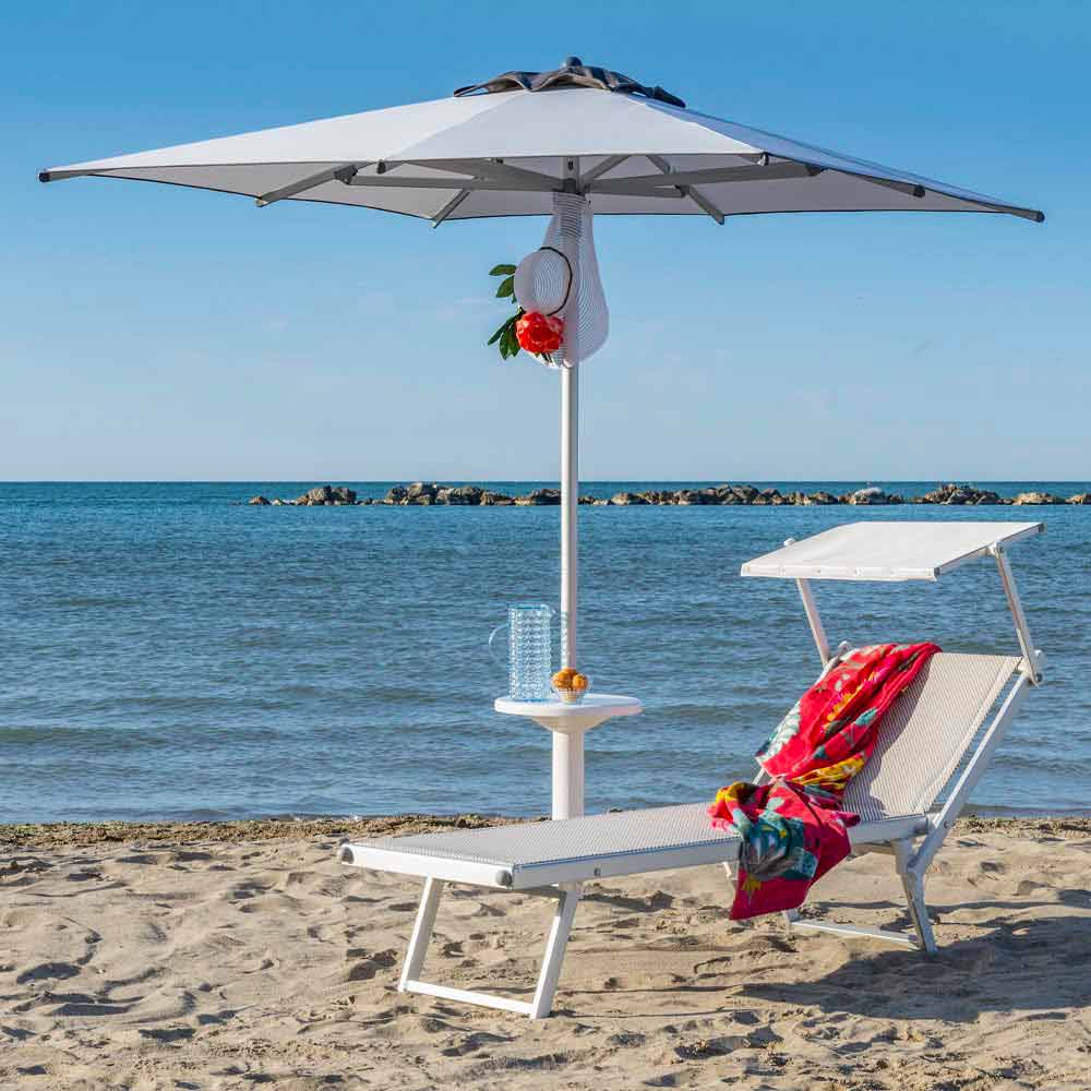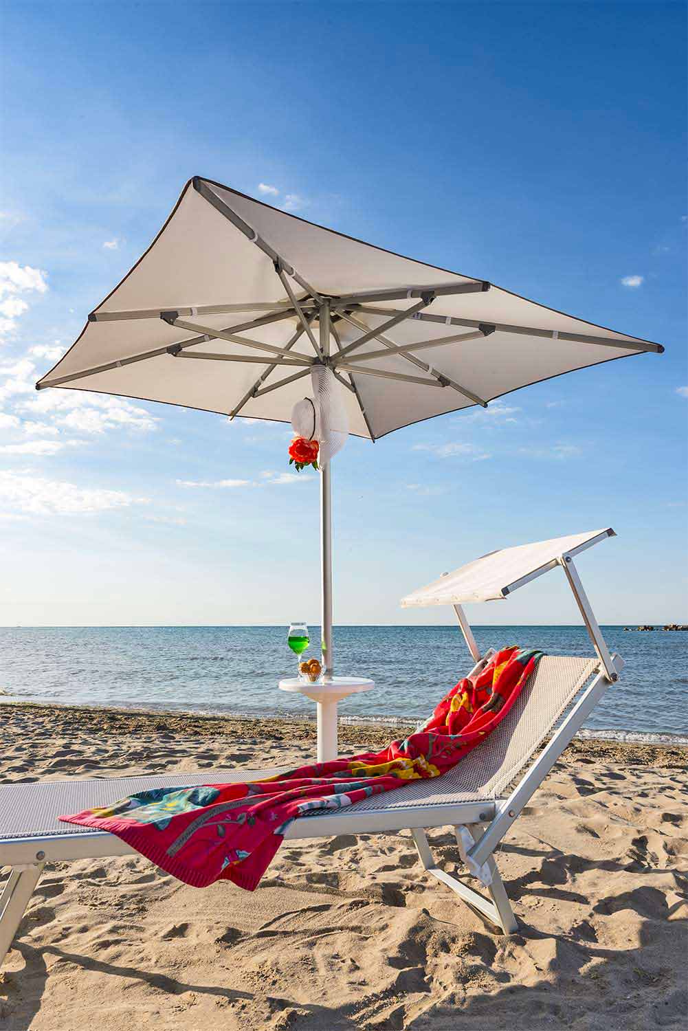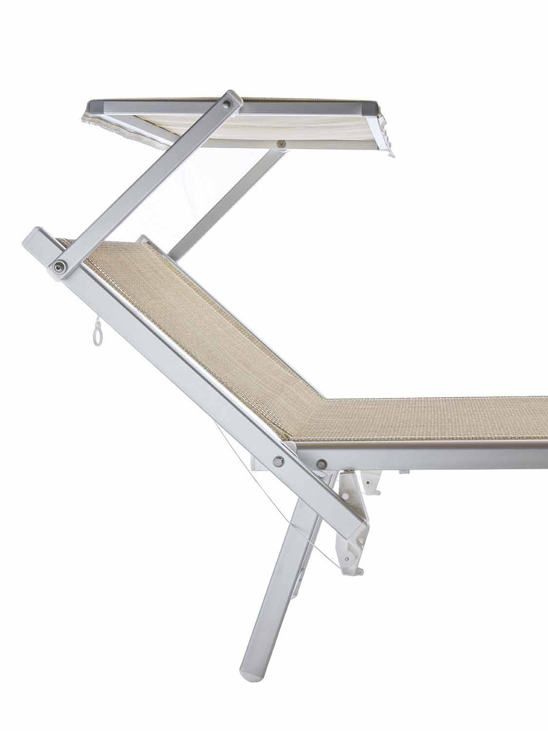 El marco está completamente construido con aluminio primario anodizado de 16 micras , mientras que todas las tuercas y tornillos están en acero inoxidable Aisi 316 . La lona y la sombrilla son de poliéster cubierto con PVC .