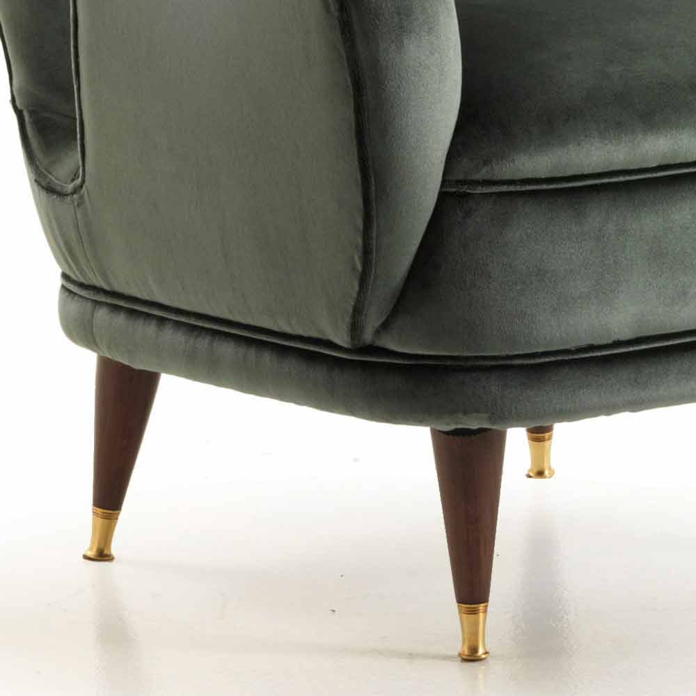 Sillón tapizado con puntas de latón patinado. Benny está inspirado en los sillones de la habitación del pasado, de los que tomó prestadas las formas sinuosas y sensuales y los pies de madera finos y cónicos. El cojín del asiento, colocado a una altura reducida, se compone de un relleno grueso, así como del respaldo alto y ancho y de los dos reposabrazos, lo que brinda una extraordinaria experiencia de confort. La forma de la espalda recuerda las proporciones de curvas muy femeninas, delineando una cintura delgada que se ensancha hacia arriba. Terminar en nogal americano oscuro.