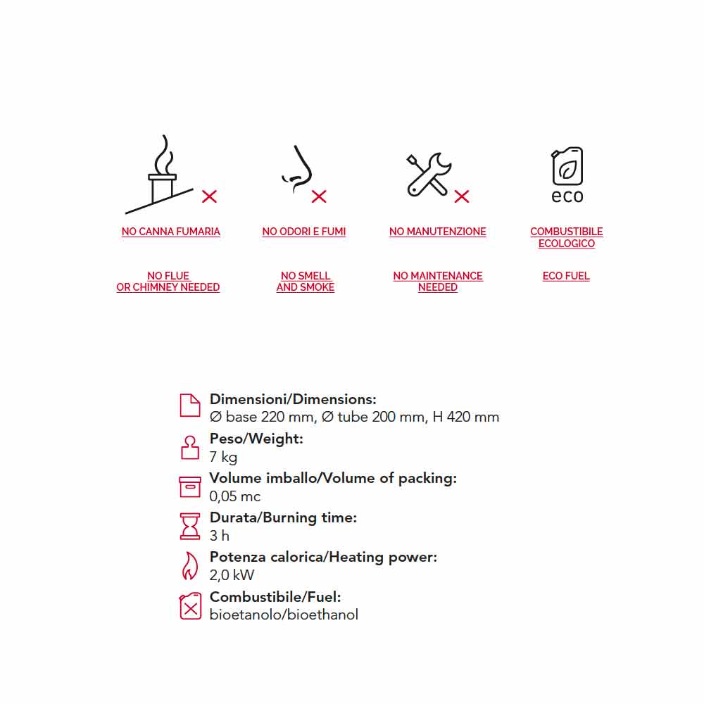 Otra de sus características es que no produce humos o vapores, además no necesita salidas de humos. Es una chimenea ecológica que no necesita ningún tipo de manutención ya que es alimentada con bioetanol, una fuente de energía renovable.