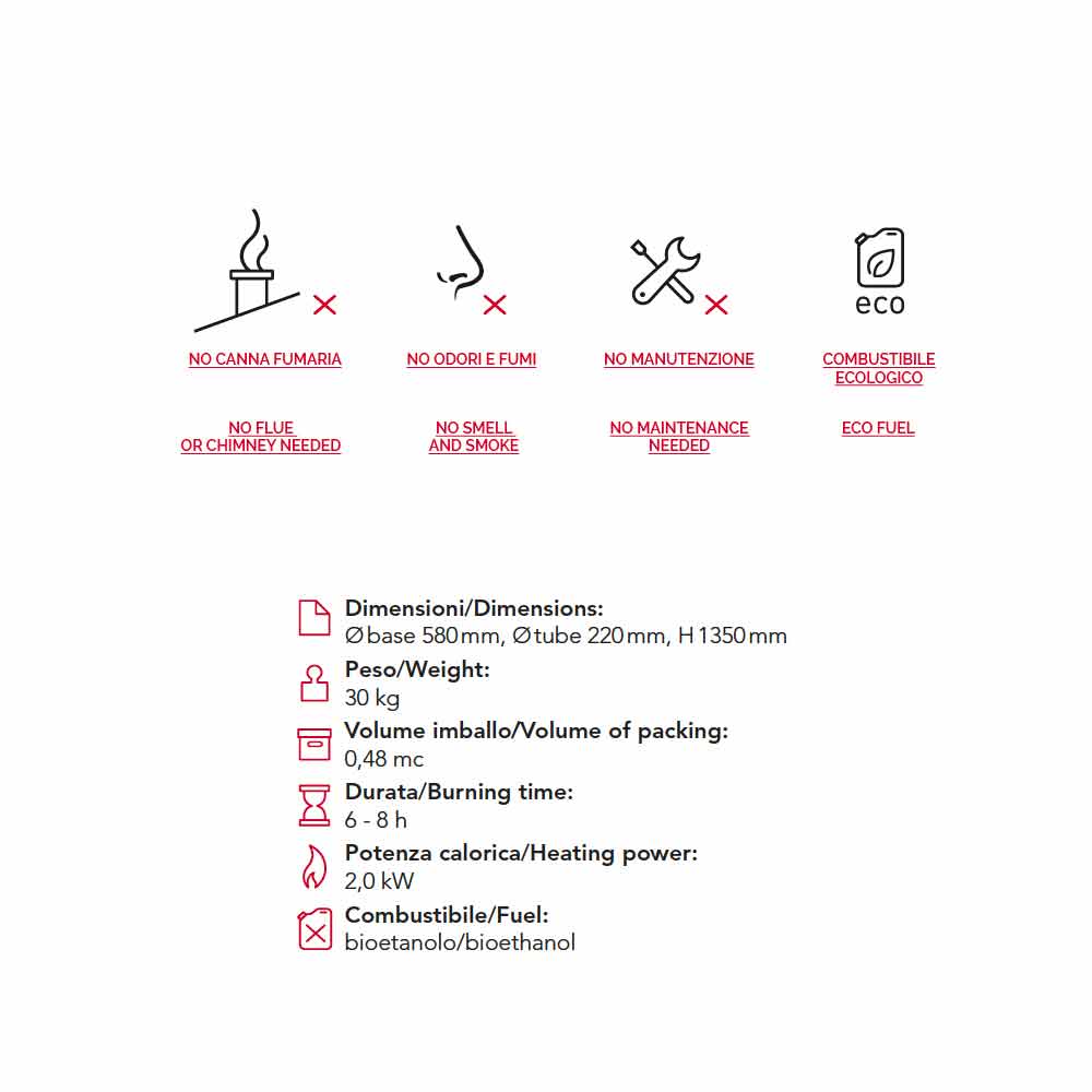 Otra de sus características es que no produce humos o vapores, además no necesita salidas de humos. Es una chimenea ecológica que no necesita ningún tipo de manutención ya que es alimentada con bioetanol, una fuente de energía renovable.