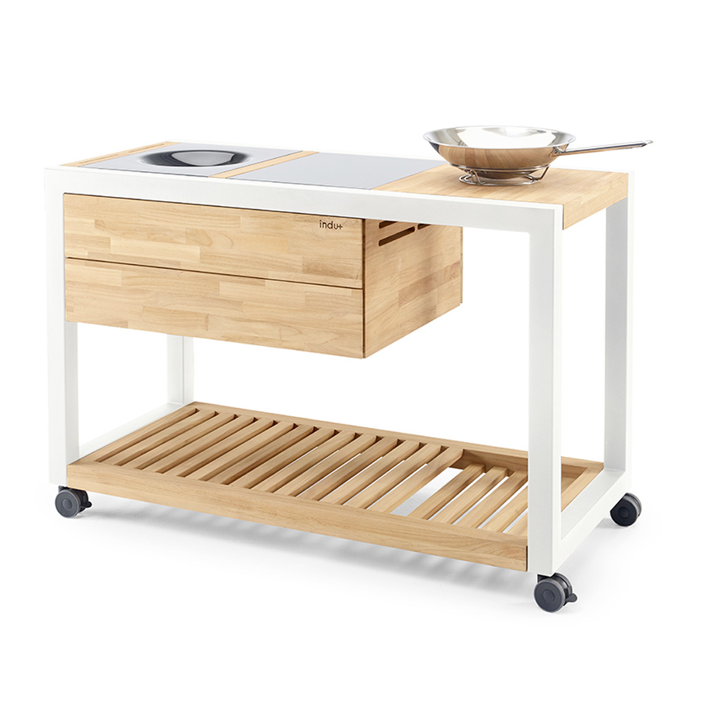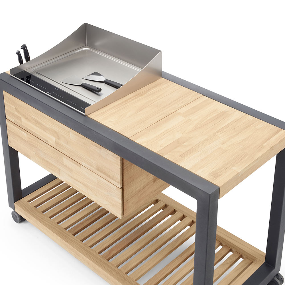 Esta cocina de exterior representa la mezcla perfecta de funcionalidad y diseño contemporáneo, ideal para convertir cada momento al aire libre en una experiencia única. La estructura de aluminio con recubrimiento de polvo ofrece robustez y resistencia a la intemperie, mientras que las inserciones de teka maciza de alta calidad tratadas con Rubio Monocoat Hybrid Wood Protector añaden un toque de elegancia natural y calidez visual.