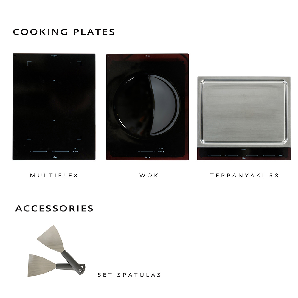 TEPPANYAKI 38/58: tecnología de inducción de última generación - toque de bloqueo - función Stop & go - 2 zonas de cocción independientes controladas termostáticamente (delantera y trasera) - cada una de 1400 W - control deslizante táctil con acceso directo a cada uno de los 10 niveles de calentamiento: 0-9 / nivel de limpieza - visualización dinámica de la temperatura para ambas zonas de cocción - toques de limpieza dedicados a cada zona