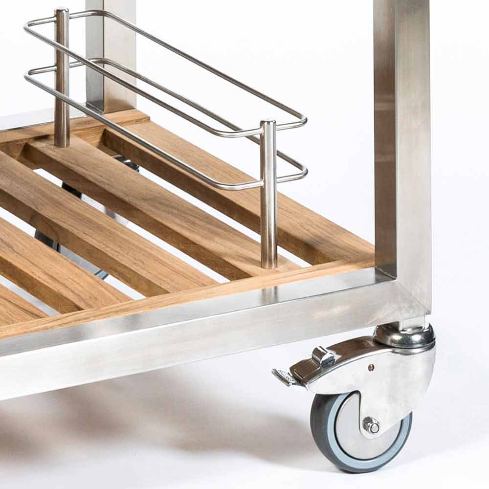 • Ruedas resistentes de acero inoxidable con rodamientos de bolas y freno, para facilitar el transporte del carro a través de cualquier superficie.