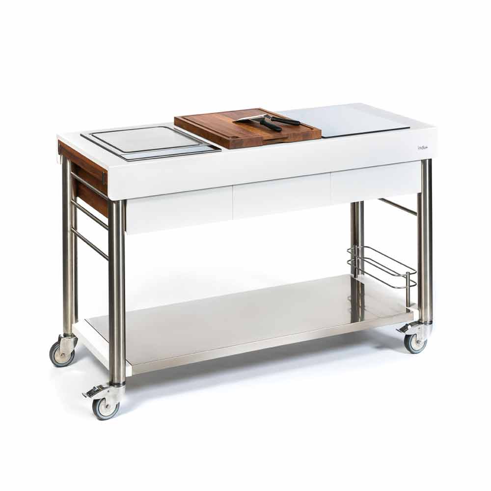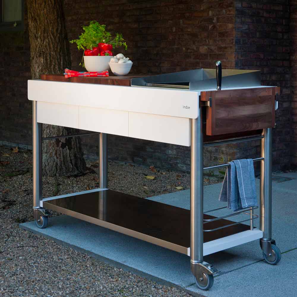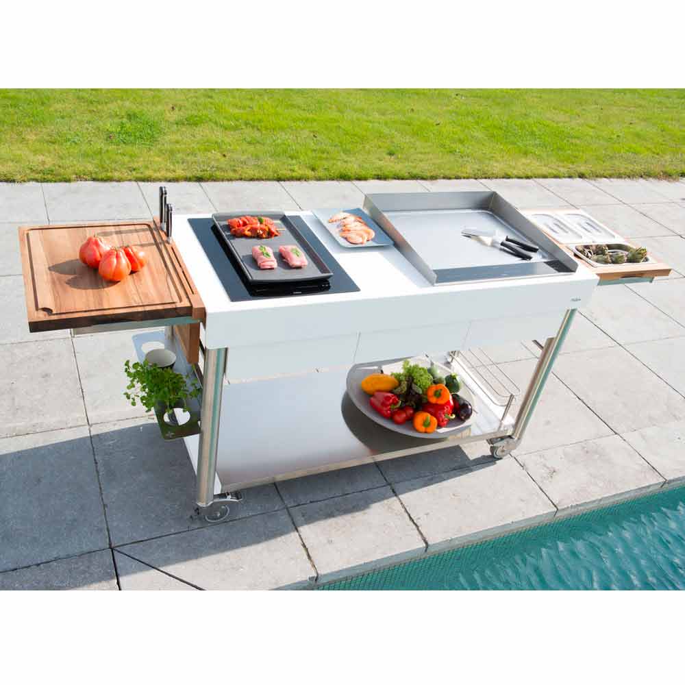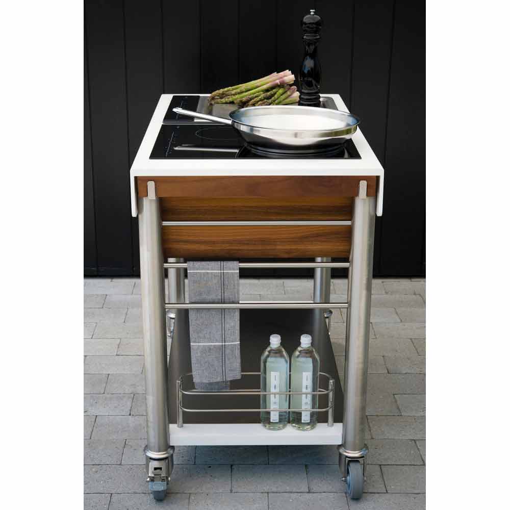 Cocina exterior con ruedas de acero inoxidable y madera de teca con placas intercambiables, dos tamaños disponibles, diseño moderno, alta calidad.