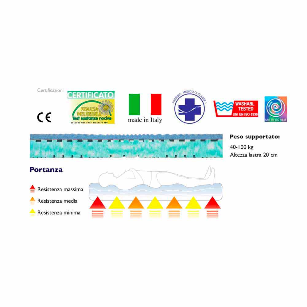 Por esta razón se recomienda el uso de este colchón, certificado como un dispositivo médico Clase I, combinado con un forro especialmente diseñado con alojamiento integrado Topper. Peso soportó 60/120 kg por persona