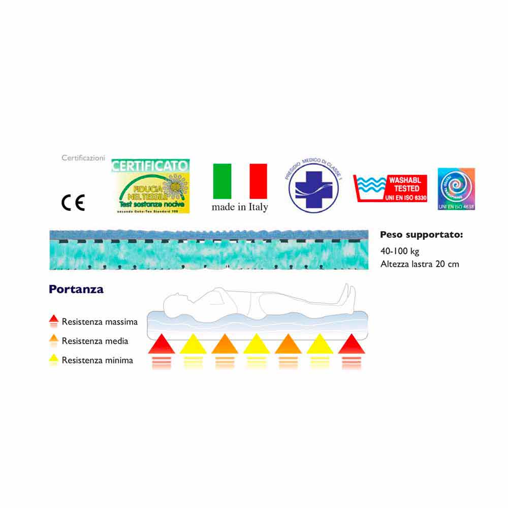 El colchón Bio Natura utiliza uno de los productos más innovadores y tecnológicos, tanto en el producto como en la configuración del colchón terminado. De hecho, la parte superior está formada por una capa de Memory sensible al aire moldeada con ondas masajeadoras de diferentes anchuras para proporcionar el efecto de las 7 zonas y gracias a su particular estructura consigue expulsar todo el exceso de calor corporal a través de los numerosos poros. del que está constituido. La mejor transpiración también está garantizada por el perfil particular y por los orificios que unen la memoria a la capa de espuma "Natura" que soporta el peso del cuerpo de manera correcta y eficaz, también moldeada en la parte inferior para facilitar el uso de este producto en redes mecanizadas. . Al no estar pegada, la parte Memory sensible al aire es completamente desmontable y lavable , una operación que no se puede realizar en productos convencionales y no probados. Por ello recomendamos el uso de este colchón, certificado como dispositivo médico de clase I , combinado con una funda especialmente diseñada con topper carcasa integrada. Peso soportado 60/120kg por persona Forro con banda 3D transpirable . Todas las fundas están confeccionadas con tejido elástico que, adhiriéndose perfectamente, son ideales para todos aquellos que deseen potenciar la calidad y características de su colchón. Gracias al acolchado rectangular o de diferentes ondas, las cubiertas tienen una consistencia suave y esponjosa, con la capacidad de recuperar fácilmente su forma ligera y aireada después de la compresión. De hecho, se pueden lavar y secar sin tratamientos especiales gracias a su elasticidad natural. El resultado es un producto perfectamente higiénico , antiácaros y de larga duración para mantener inalteradas sus características a lo largo del tiempo. Para lograr un alto nivel de transpirabilidad, las cubiertas están equipadas con una banda 3D que permite una mejor circulación del aire para garantizar una microclima perfecto dentro del colchón.