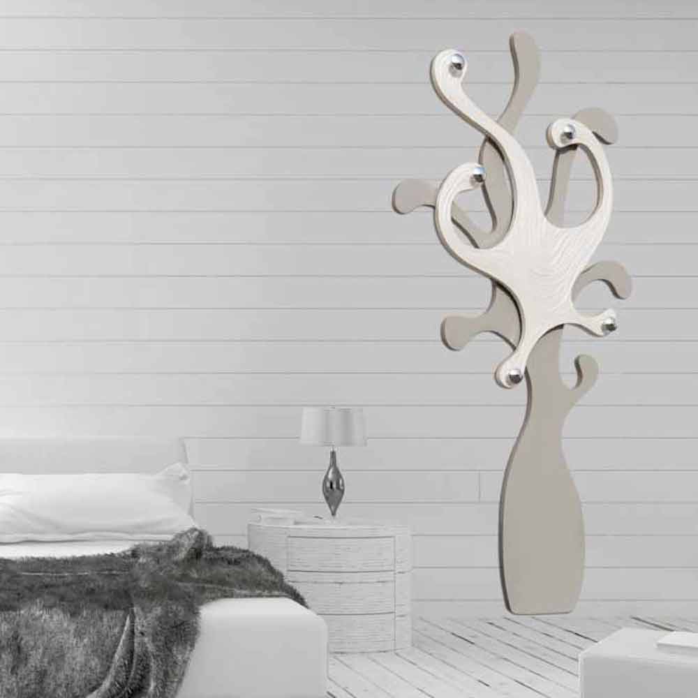 Este fantástico colgador se caracteriza por una estructura que consta de dos elementos, tanto de MDF de la forma original que se asemeja a un pulpo. El elemento subyacente está conformada y paloma lacado, mientras que el elemento superior es pintado con efecto perla en el procesamiento de materiales en relieve enriquecido con cinco mandos de cromo mano.
