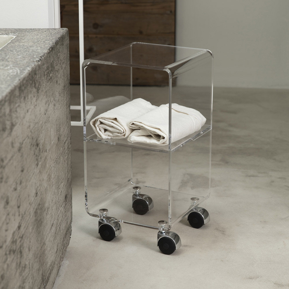 Carro columna en cristal acrílico transparente con ruedas y 1 o 3 estantes, fabricado en Italia.