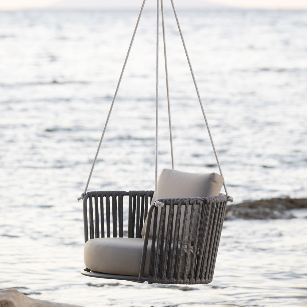 Columpio para mobiliario de exterior de acero galvanizado y cuerda, fabricado íntegramente en Italia, con cojines de asiento y respaldo y cuerdas incluidas . El galvanizado proporciona una mayor resistencia del acabado del material a los agentes atmosféricos corrosivos, mientras que las cuerdas son resistentes al cloro, la luz solar y el moho. Los cojines están fabricados con material resistente a los rayos UV y al agua, lo que mantiene el color durante mucho tiempo, lo que convierte al columpio en un elemento perfecto para amueblar cualquier espacio exterior.