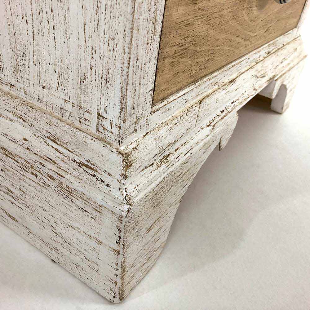 Mueble con cajones en madera sólida instigar y hecho a mano en Italia en acabado blanco envejecido. Los 4 cajones tienen una estructura de contrachapado de chopo de 10 mm para mantener más espacio en su interior, mientras que el panel frontal es de madera de 18 mm y se completa con pomos especiales de cerámica pintados a mano. Los maravillosos colores que enriquecen los cajones se obtienen gracias al uso de terrenos naturales agregados con colas de origen animal, materiales elegidos como alternativa a las pinturas industriales comunes. Esta elección de construcción significa que cada artículo puede minimizar la presencia de formaldehído, una sustancia nociva clasificada como carcinógena. La cómoda se completa finalmente con un acabado transparente que la hace repelente al agua y fija los colores para hacerlos inalterables con el tiempo.