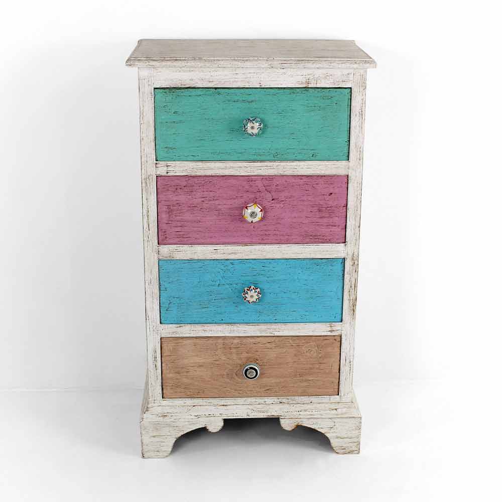 Cómoda artesanal de madera maciza con 4 cajones de colores, Made in Italy de alta calidad.
