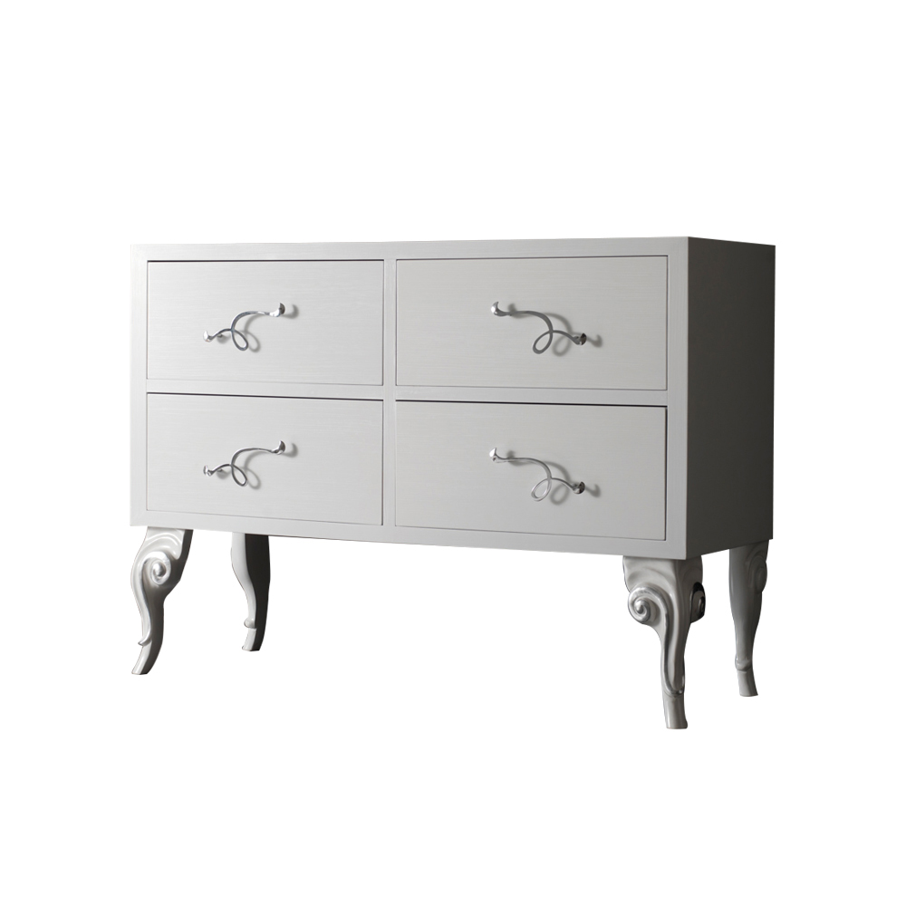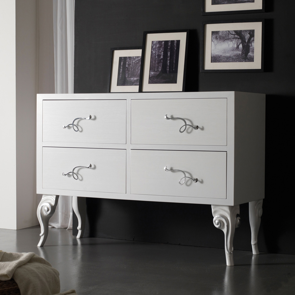 Cómoda realizada en tablero block de Tilo con acabado artesanal en nácar y guías acolchadas, compuesta por 4 cajones. Gracias a sus acabados y líneas suaves y sinuosas , tiene todo el encanto de un estilo clásico y elegante y es el elemento perfecto para completar y personalizar tu ambiente. La funcionalidad y la capacidad están garantizadas por los cajones que acomodan ordenadamente diversos objetos y por la superficie sobre la que colocar objetos útiles. La atención al detalle y la elección de los mejores materiales por parte de expertos artesanos italianos garantizan la calidad del Made in Italy.