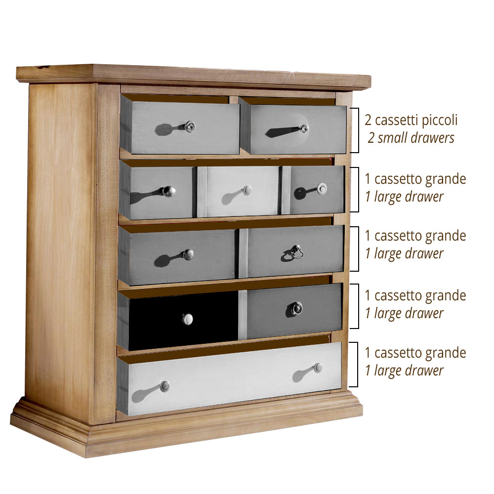 El diseño de los cajones es puramente estético. Empezando por arriba hay 2 cajones pequeños seguidos de 4 grandes. Contáctenos para cotización o información mediante el formulario "