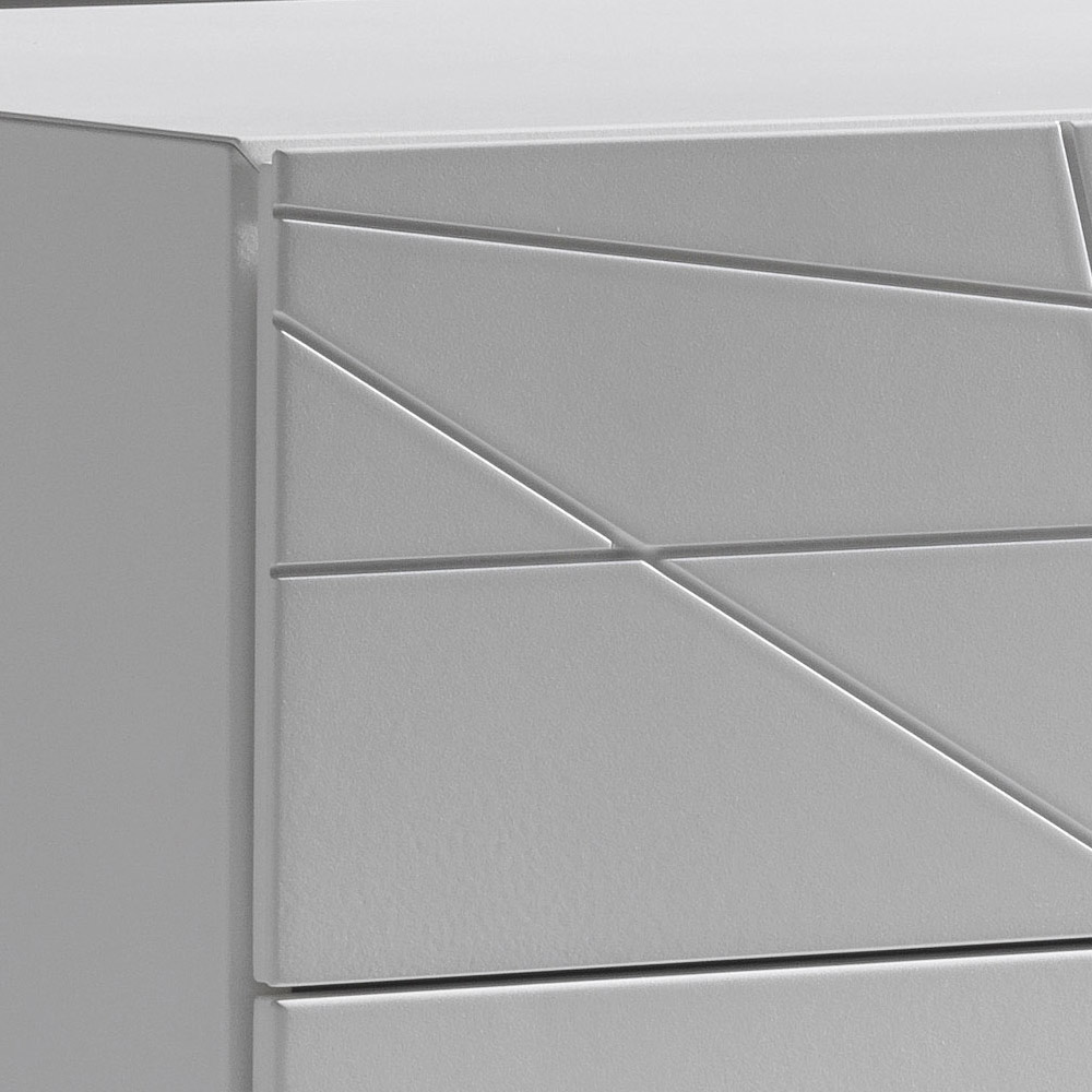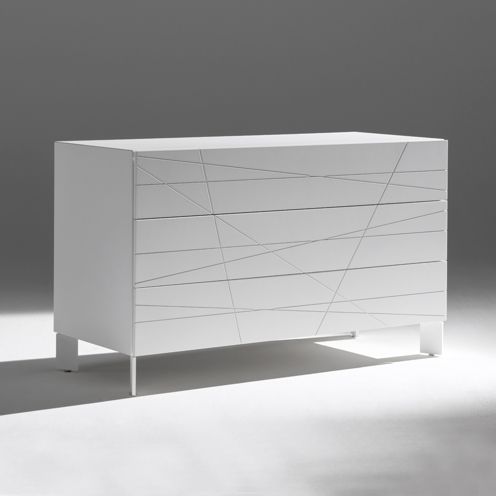 Una cómoda con un diseño contemporáneo y riguroso, con una fuerte identidad gráfica y líneas limpias. Las incisiones geométricas en los frentes crean un elegante juego de líneas que interactúa con la luz, convirtiéndola en una auténtica pieza destacada en el dormitorio.