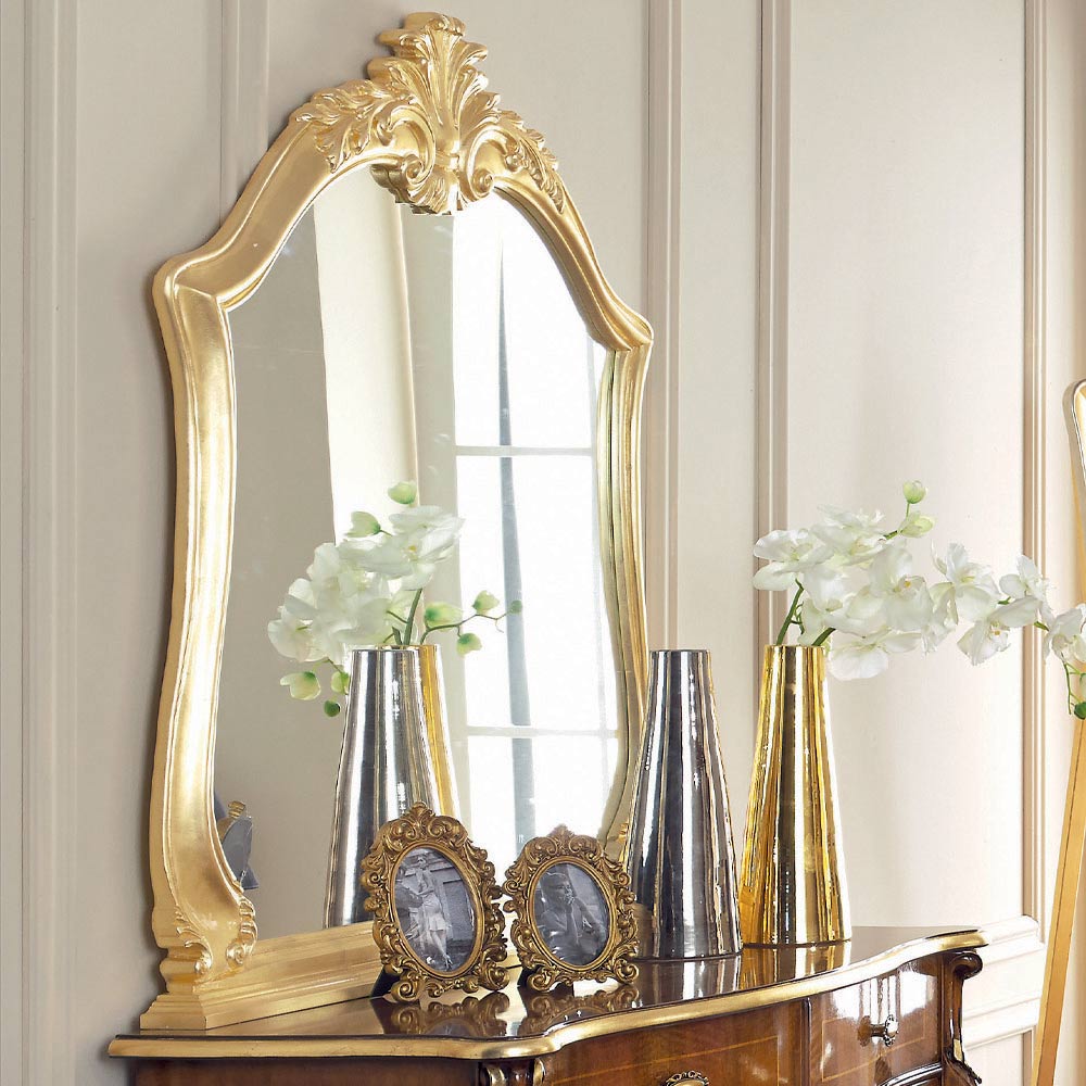 Cómoda para dormitorio realizada en nogal Bassano y oro antiguo con elegantes incrustaciones y 5 prácticos cajones. La cómoda también se completa con un espejo perfilado de madera cubierta con pan de oro.Un complemento único y refinado, realizado íntegramente en Italia por expertos maestros artesanos , maestros del arte que terminan cada complemento con sabiduría y gusto por la elegancia. La producción se lleva a cabo utilizando materiales nobles y realizando el trabajoamano con el máximo cuidado y profesionalismo que distingue a los productos Made in Italy .