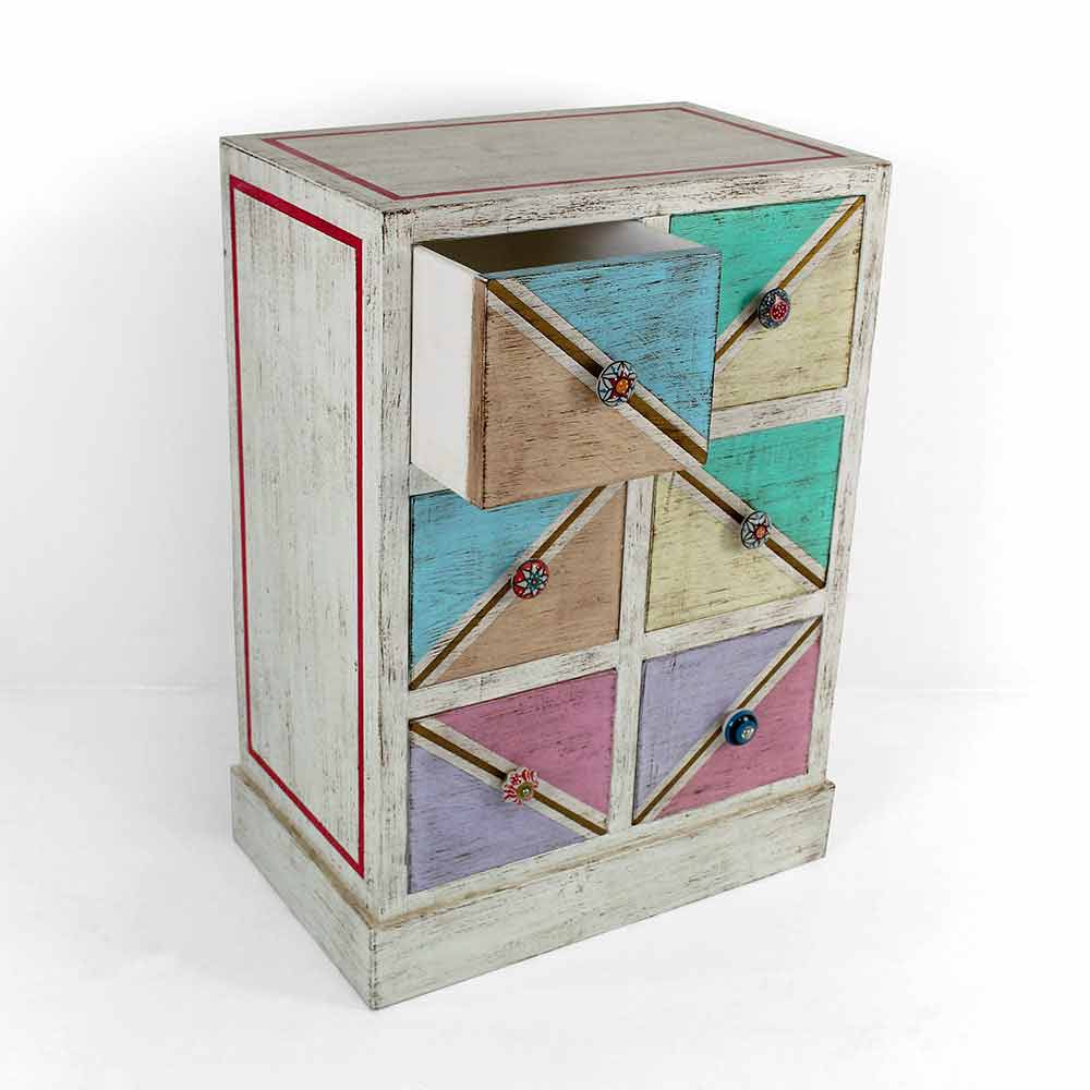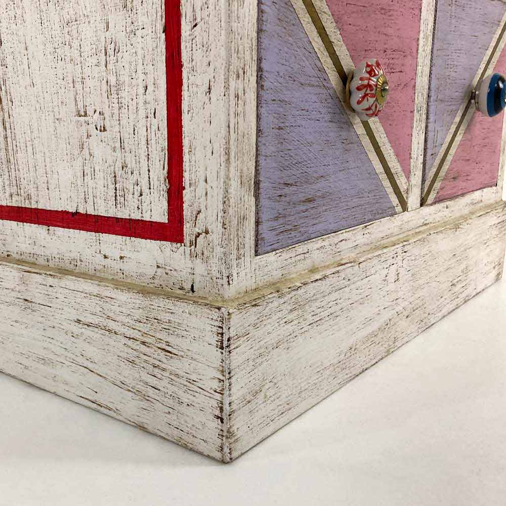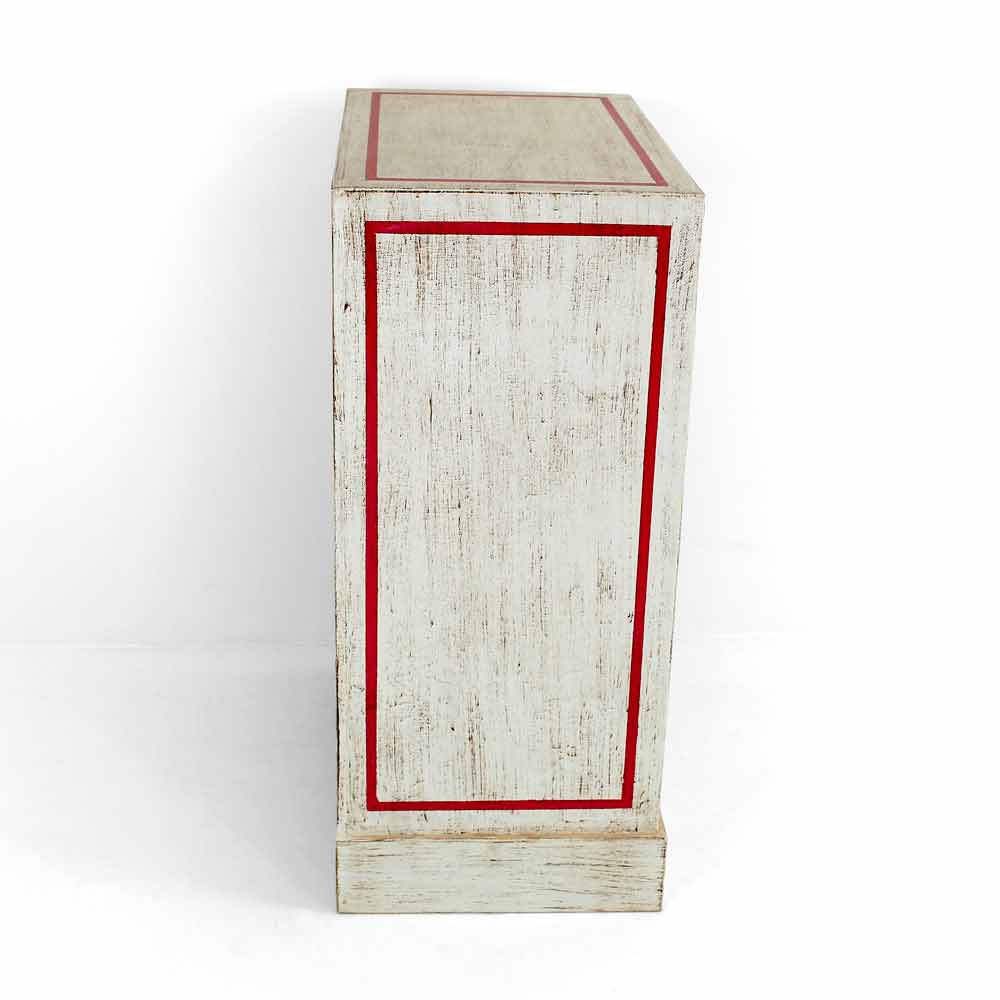 Cajonera hecha a mano en Italia con estructura en madera maciza de abet y acabado blanco envejecido y 6 cajones en contrachapado de álamo con panel frontal de madera pintado en diagonal y detalles en oro antiguo y rojo. El producto tiene un acabado transparente que lo hace repelente al agua y fija los colores para hacerlos inalterables con el tiempo.