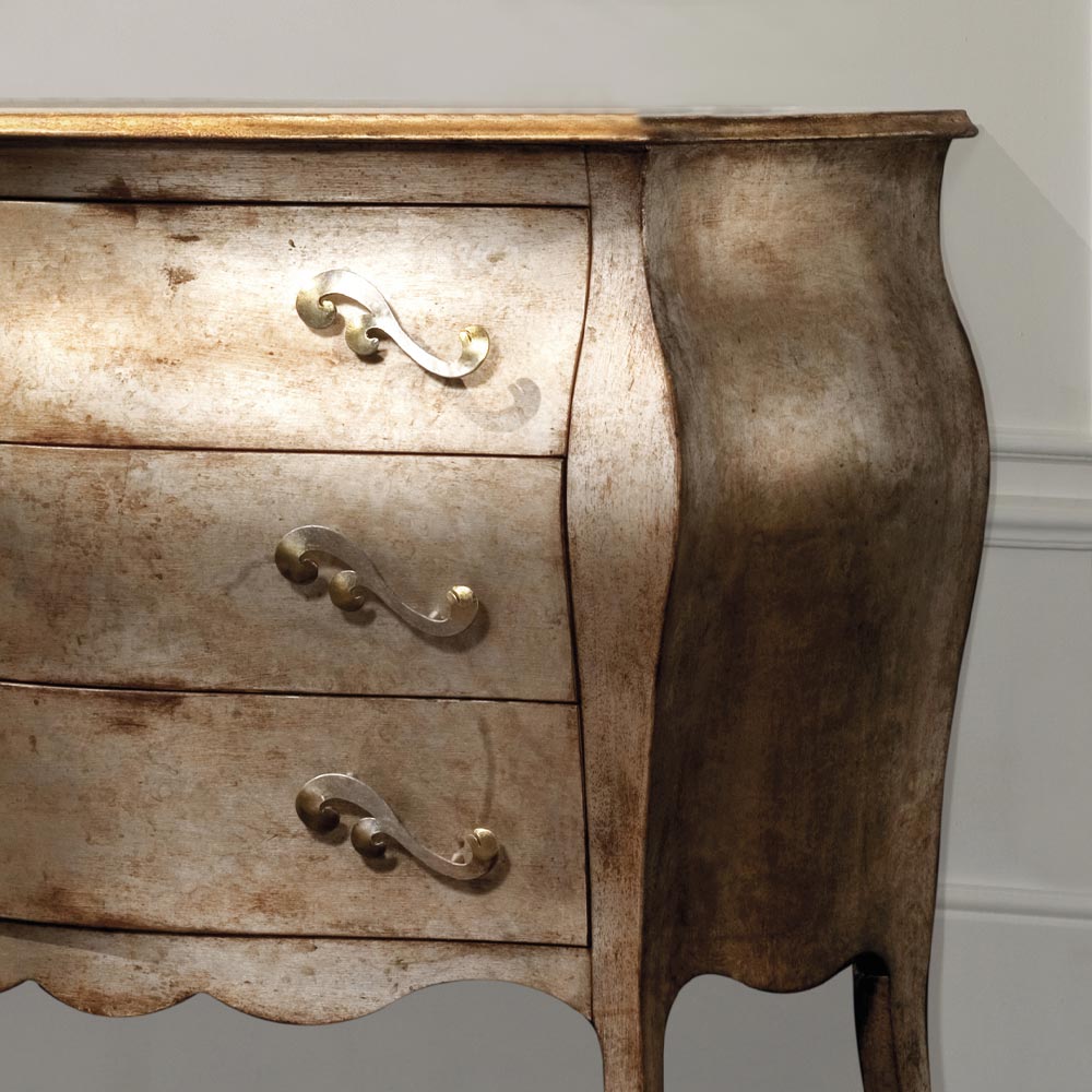 Cómoda realizada en tablero block de Lima con acabado en hoja artesanal, compuesta por 3 cajones con tiradores en pan de plata meca. Los artesanos italianos expertos en el sector han prestado el máximo cuidado y atención a la creación de cada detalle y a la elección de los materiales para garantizar toda la calidad de un producto fabricado en Italia. Las líneas suaves y sinuosas y los finos acabados dan vida a un elemento capaz de completar y personalizar el ambiente, ofreciendo al cliente gran capacidad y funcionalidad.