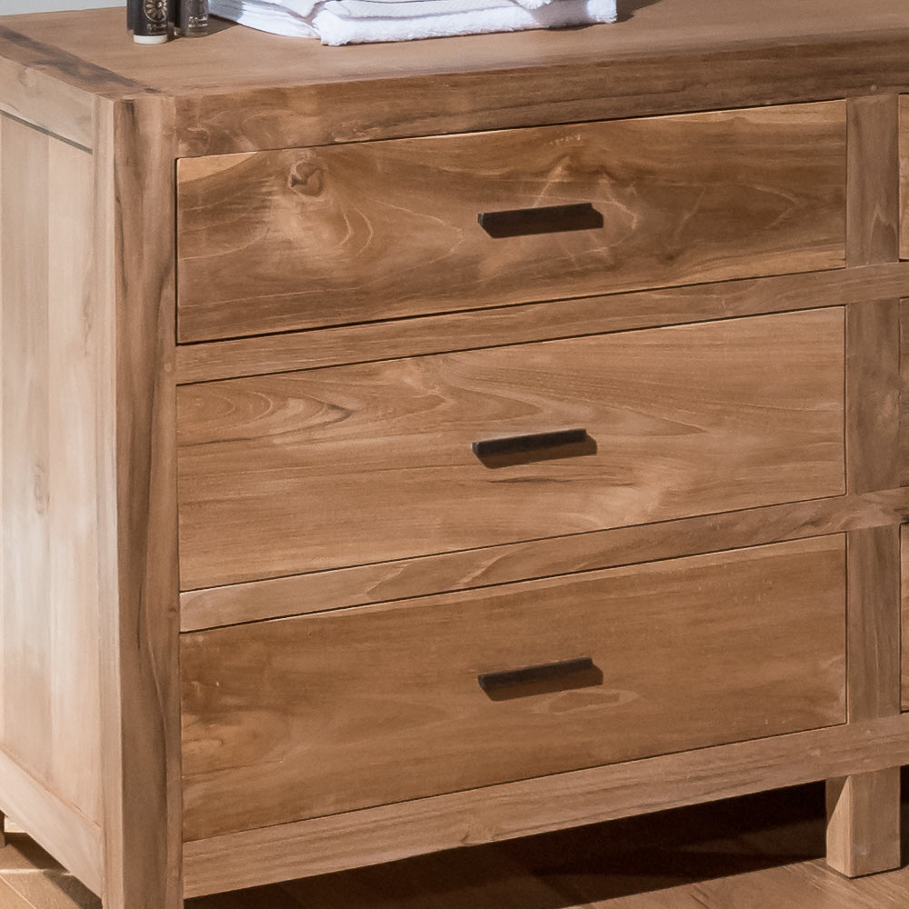 Esta cómoda de teca maciza es una pieza robusta y elegante, ideal para decorar tu dormitorio o sala de estar con estilo. Su artesanía y las vetas naturales de la madera le otorgan un aspecto cálido y auténtico, capaz de realzar cualquier espacio.