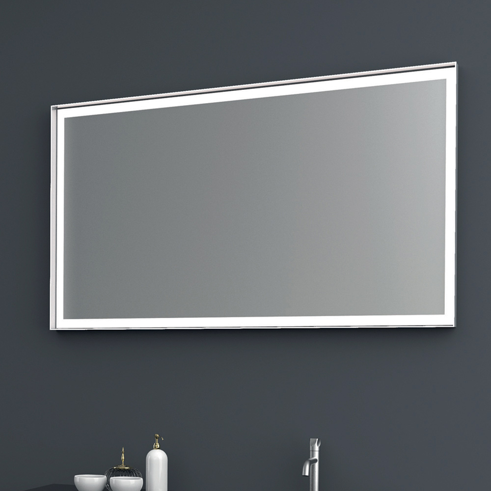 espejo pulido con chorro de arena con iluminación LED en los 4 lados combinados con un marco de metal antiguo pintado en platino.