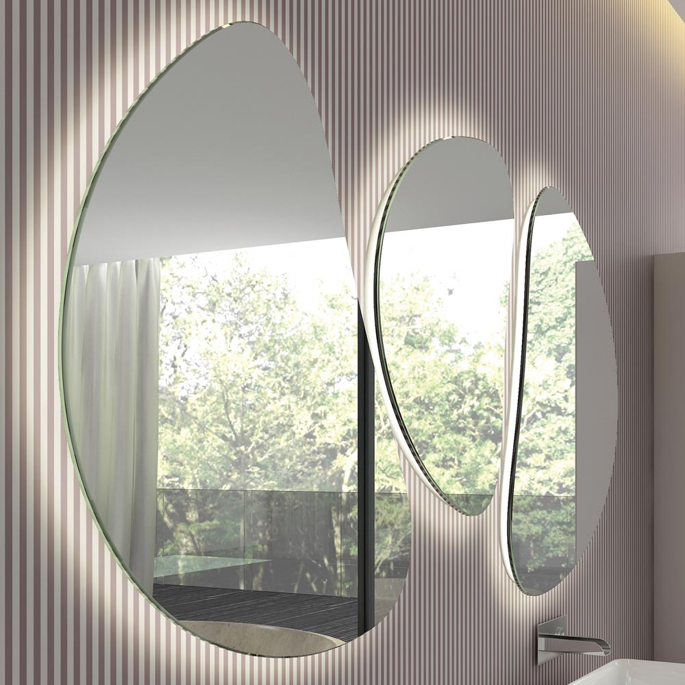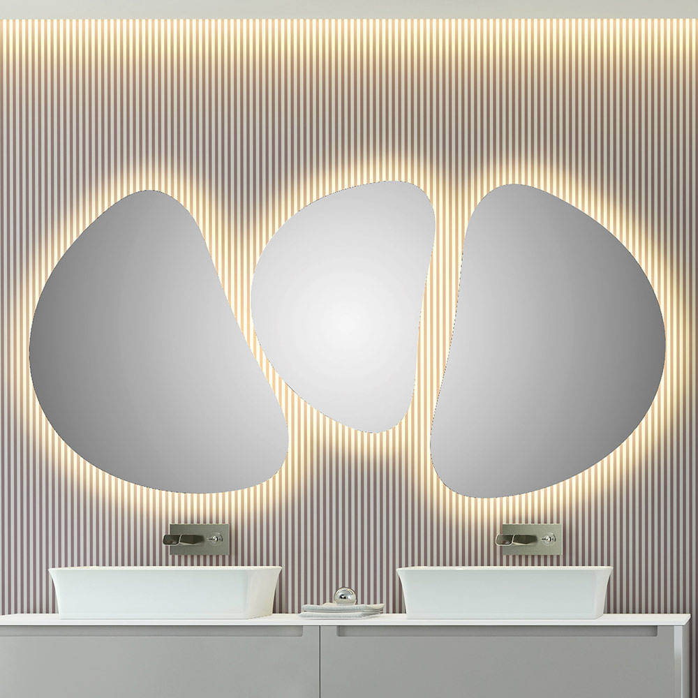 La peculiaridad de esta composición de espejos de pared consiste en la iluminación LED , que completa el diseño moderno y original de estos elementos con formas minimalistas y esenciales , plasmadas en forma de frijol. La retroiluminación LED de 4000k se extiende desde los bordes para una doble función: la de iluminación ambiental o la de iluminación directa sobre la zona del fregadero.