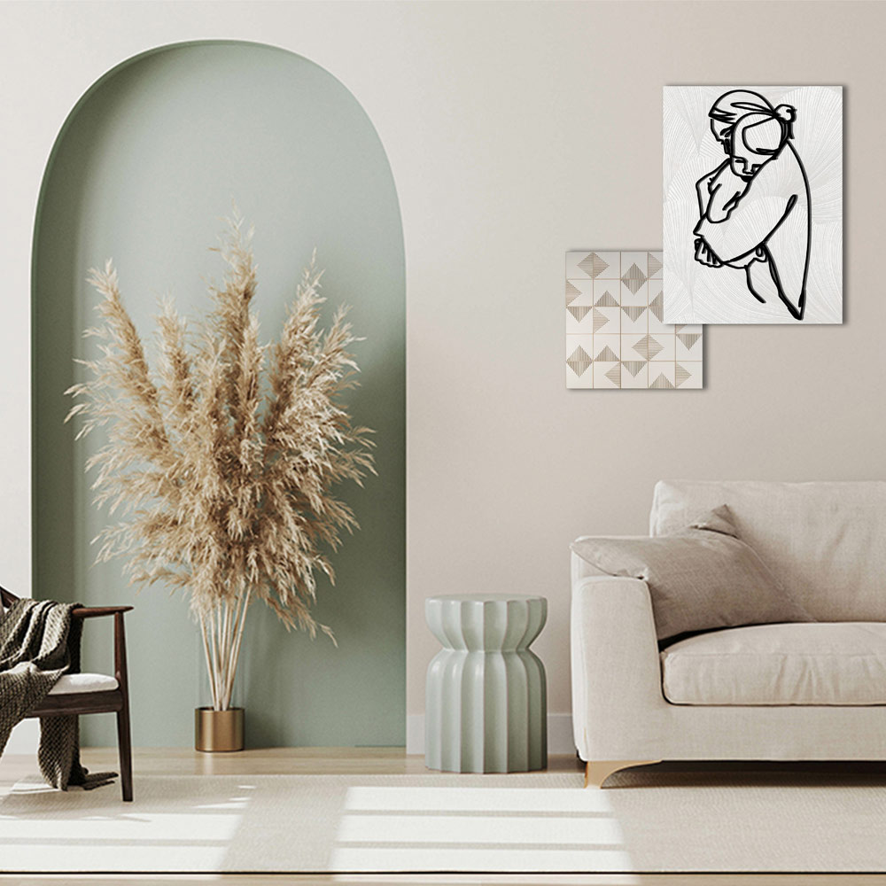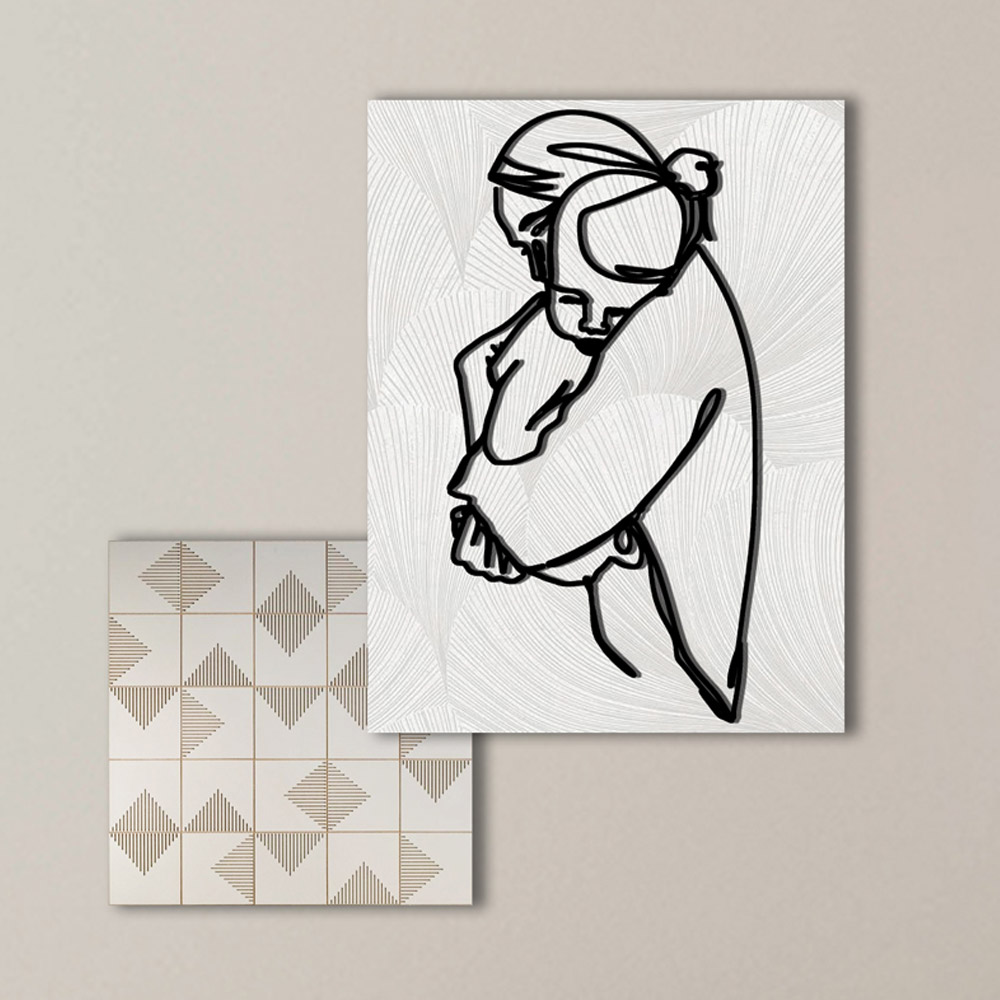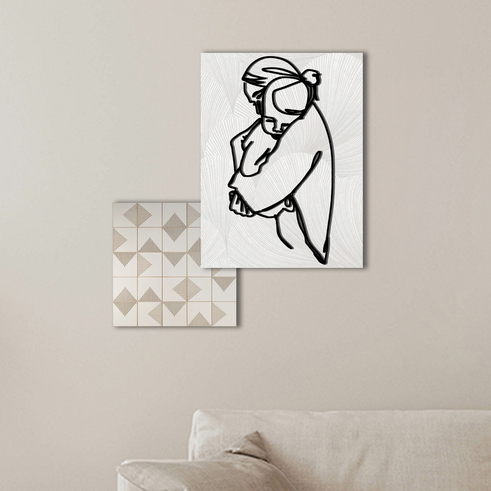 Composición de dos paneles de diferentes formas y tamaños que combinan decoraciones láser e impresas. Los dos cuadros se pueden colocar en la pared como se desee, incluso por separado.Compuesto por 2 paneles de madera impresos : uno rectangular que representa un abrazo entre madre e hijo y otro cuadrado con motivos geométricos triangulares. La composición tiene la gran ventaja de haber sido dibujada a mano y la estilización del abrazo despierta en el observador emociones de afecto y calidez. Los acabados únicos y la gran calidad del material utilizado para la construcción se unen para crear un producto con un diseño único.