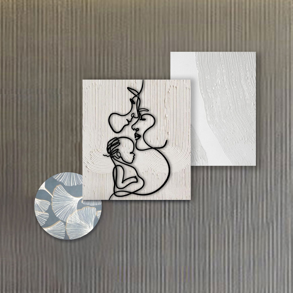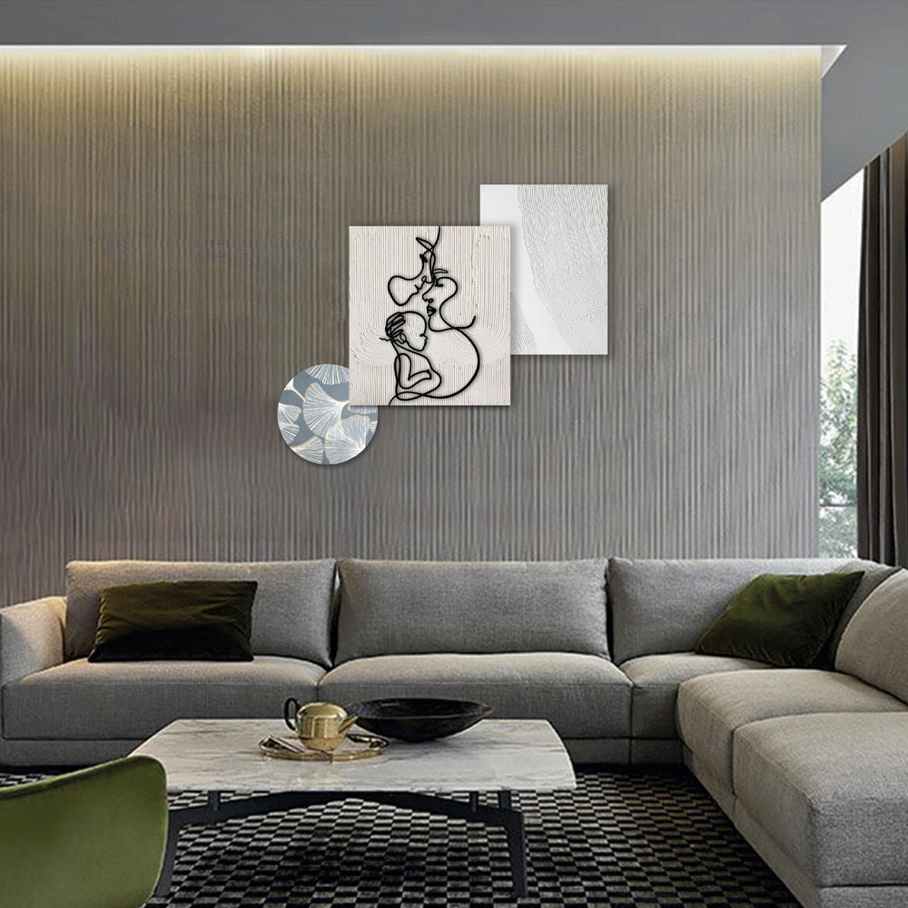 Composición de tres paneles de diferentes formas y tamaños que combinan decoraciones láser e impresas . Compuesto por tres paneles de madera estampada : uno redondo con pétalos blancos, uno rectangular que estiliza el amor de una familia y otro rectangular con líneas en alto relieve. Composición de paneles modulares : cada panel es único y se puede colocar en la pared a su gusto, creando juegos de superposición en constante cambio. Esta composición de estilo moderno tiene un gran impacto visual y despierta en el espectador un sentimiento de cariño y calidez. La unión de las formas y colores de los 3 paneles crea un juego visual que se adapta para ser colocado en cualquier estancia de la casa.