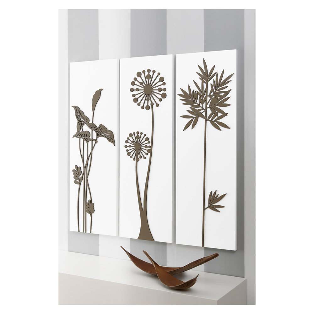 La composición de los paneles se realiza mediante la técnica de marcado láser que crea un bajorrelieve en el material, creando diferentes gradaciones de color creadas en el panel. El panel es de madera lacada en blanco con decoración gris tórtola . Representa flores y hojas estilizadas, que crean un trío esencial de paneles.
