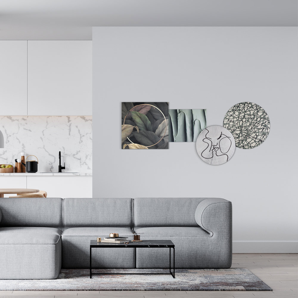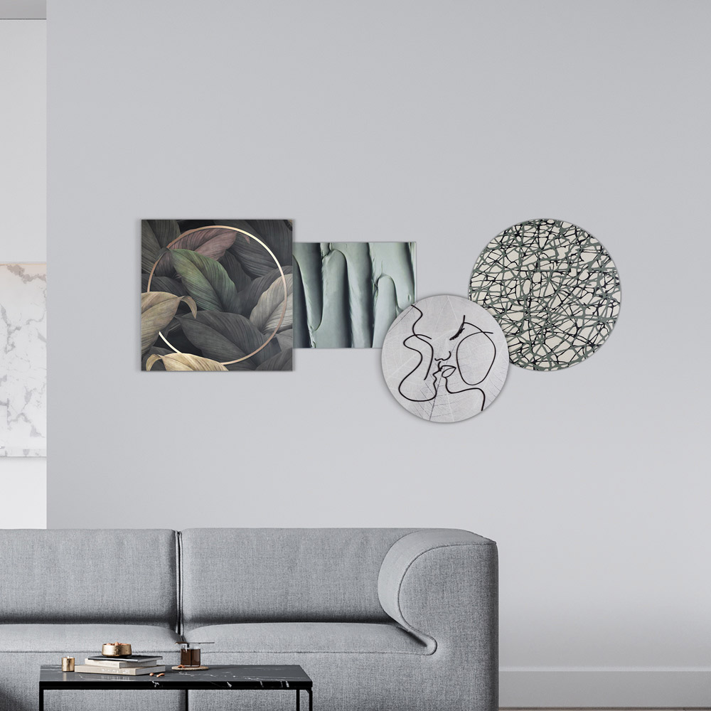 Composición de cuatro paneles de diferentes formas y tamaños que combinan decoraciones láser e impresas . Compuesto por cuatro paneles de madera estampados : uno cuadrado con hojas, uno rectangular con líneas curvas, uno redondo que representa el beso y otro redondo con líneas entrelazadas en tonos verdes y negros. Composición modular : cada panel es único y se puede colocar en la pared como quieras, creando juegos de superposición en constante cambio. Esta combinación le da a la habitación un toque moderno y único. La combinación de acabados y colores de cada uno de los paneles crea una combinación capaz de despertar las más diversas emociones.