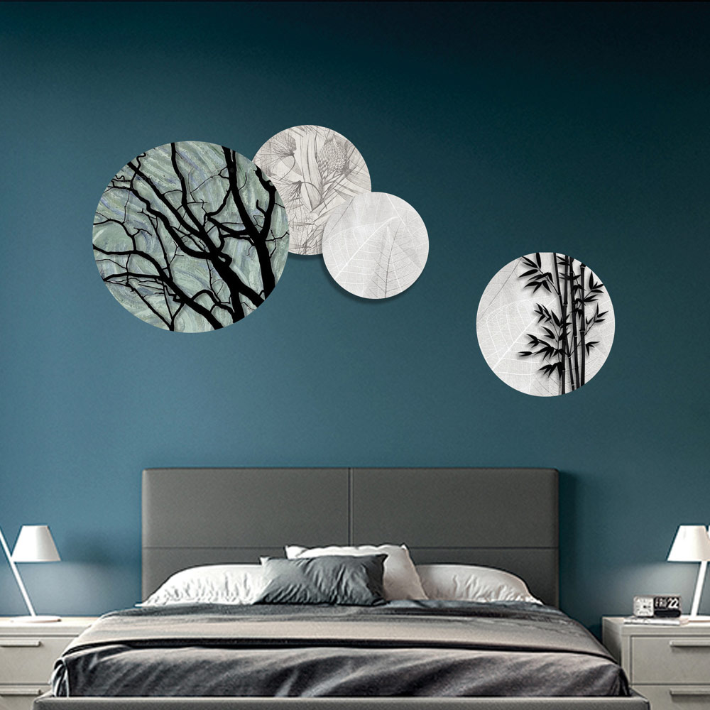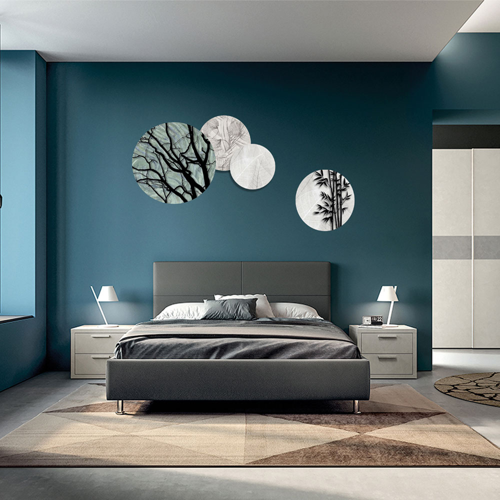 Composición de cuatro paneles de diferentes medidas que combinan decoraciones láser e impresas . Compuesto por cuatro paneles circulares de madera impresa : uno representa ramas negras sobre fondo verde/azul/gris, uno de hojas en tonos marrones y fondo arena, uno con hojas blancas y fondo gris y el otro con hojas blancas y ramas negras. Cada panel es único y se puede colocar en la pared como desee, creando efectos superpuestos en constante cambio. Estas pinturas son el resultado de la artesanía italiana, de hecho, las figuras están dibujadas a mano y luego pintadas con la luz del rayo láser, sin desperdicio y respetando el medio ambiente. La unión de acabados y colores crean una sugerencia visual y emocional en quien los observa y le dan al ambiente ese toque único y atemporal.