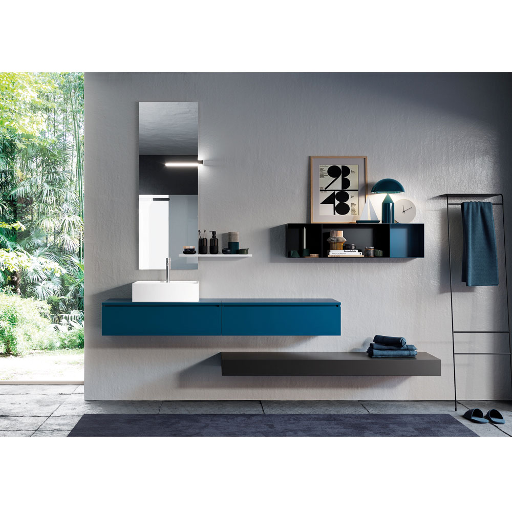 También se incluyen los 4 cubos colgantes de metal lacado en azul brillante/azul claro y negro y el estante perfilado delante del espejo en MDF blanco brillante.