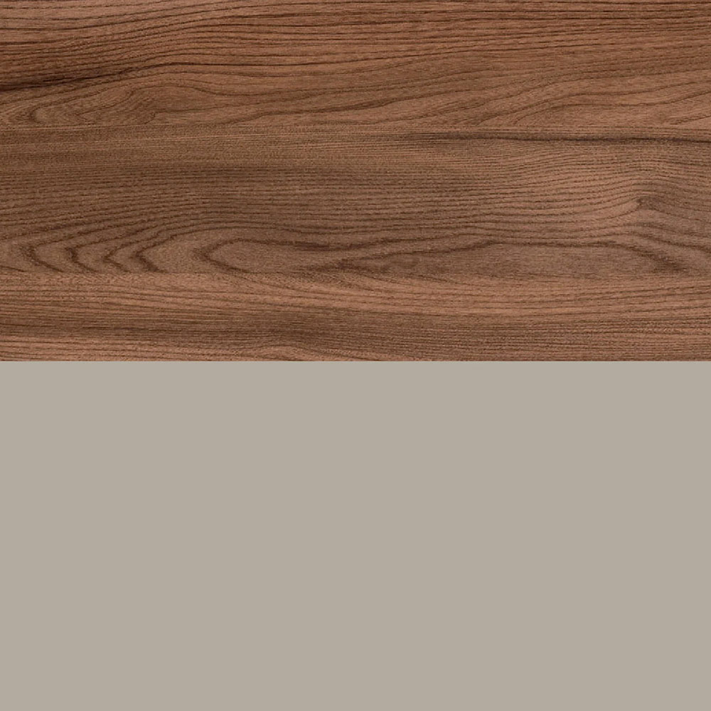 Lo más destacado es la balda con acabado en roble y soportes, que aporta calidez visual y ligereza estructural a la pared, creando un elegante efecto suspendido. La balda doble amplía el espacio de la encimera y realza la verticalidad del baño.