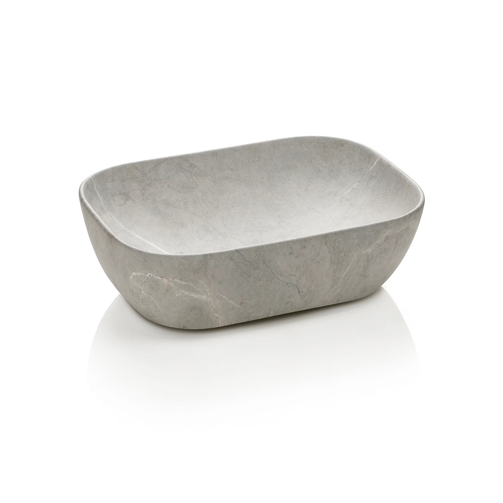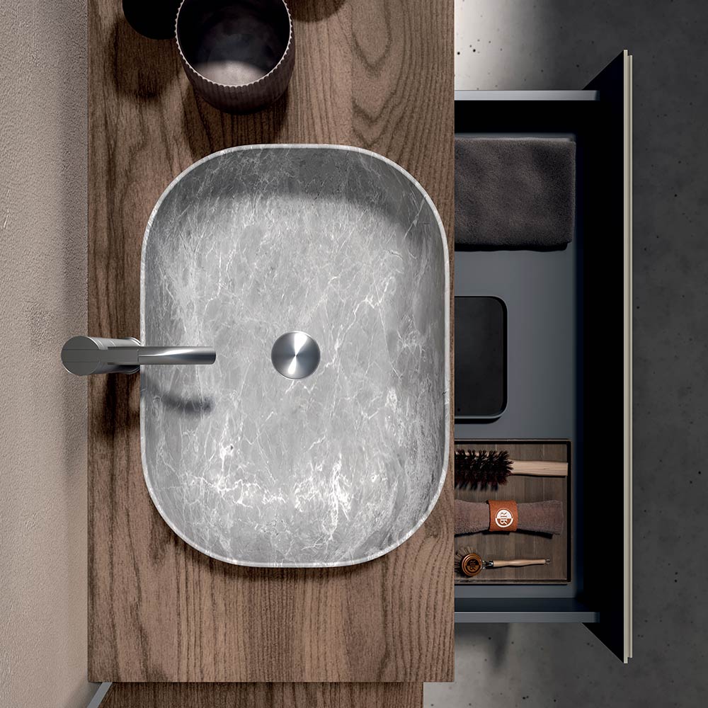 El lavabo de cerámica de piedra gris añade un sofisticado toque de materialidad: compacto, funcional y perfectamente integrado en la composición, combina resistencia y estilo en un solo elemento.