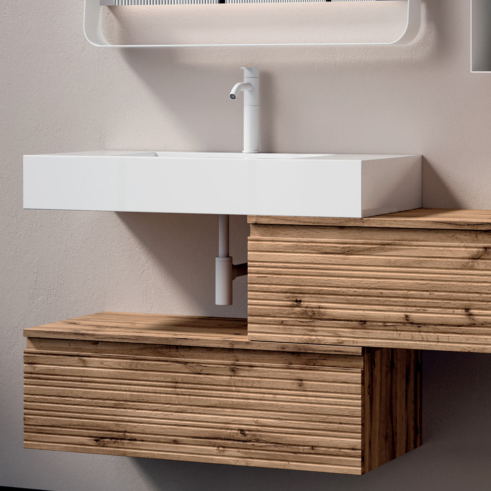 Elegante composición de baño suspendida que combina la calidez de la madera natural con líneas contemporáneas, ideal para baños modernos y refinados.